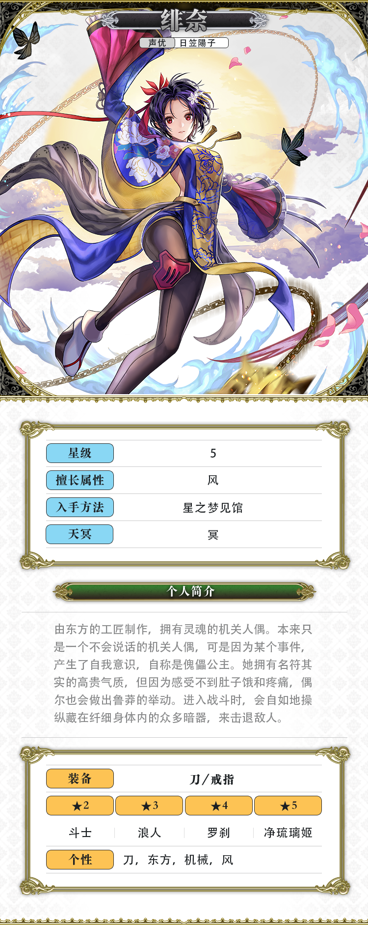 LV1 - 【愿将此誓言,奉献祖国】给予全体敌人风属性突攻击(小)+附加中毒和受伤效果(3回合,无视对方耐性)LV2 - 【好好领教一下,何谓机关人偶的骄傲吧!】给予全体敌人风属性突攻击(中)+附加中毒和受伤效果(3回合,无视对方耐性)LV3 - 【妾身将再次成为傀儡公主!】给予全体敌人风属性突攻击(大)+附加中毒和受伤效果(3回合,无视对方耐性)LV3 - 【妾身将再次成为傀儡公主!