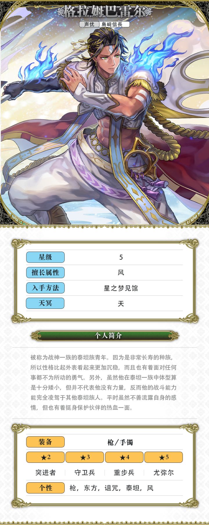 LV1 - 【烙印下……泰坦一族的骄傲吧!】自身枪装备者伤害25%UP(3回合)LV2 - 【指引……那些迷惘自身命运的同胞吧!】自身枪装备者伤害50%UP(3回合)LV3 - 【开拓……那看得见一丝光芒的大地吧!】自身枪装备者伤害75%UP(3回合)LV3 - 【开拓……那看得见一丝光芒的大地吧!】(VC灵晶强化)我方全体枪和弓装备者伤害100%UP(3回合)固有能力【战斗开始