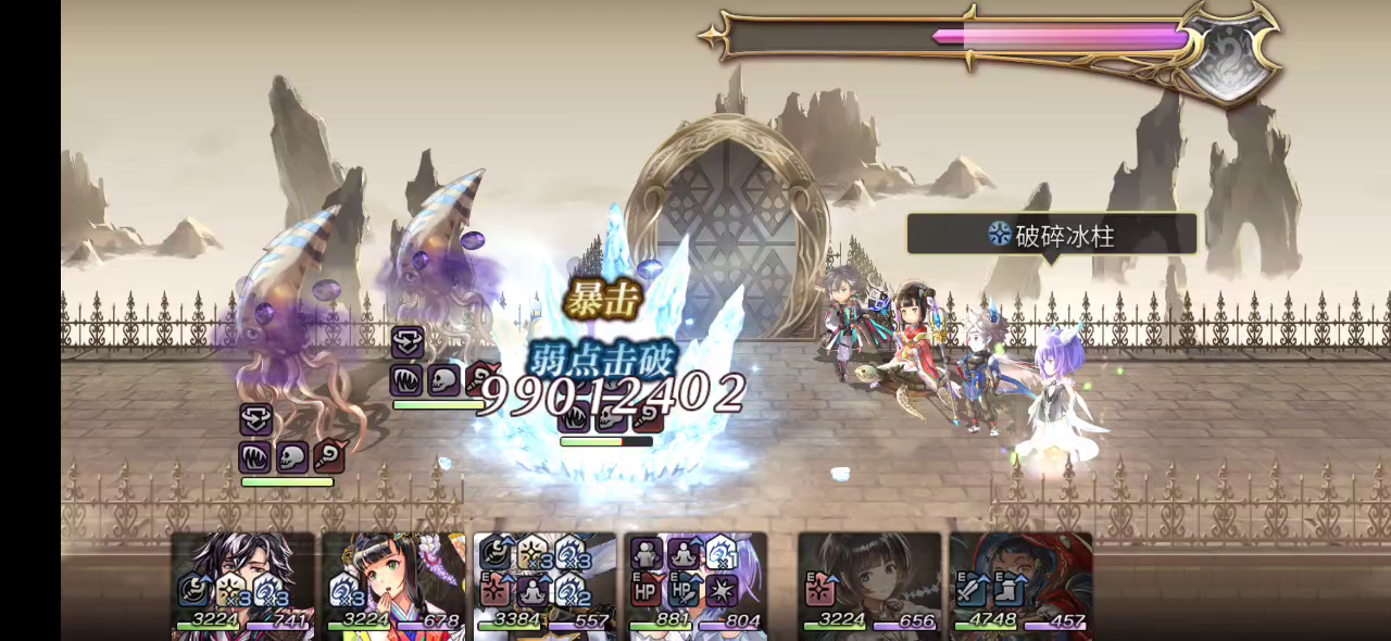 听说苏菲不能逃课了,但是炼金妹来了,和泰坦妹一起正好一个打上面的弱水,一个打下面的弱晶,不用控伤害,不用af,手残党的福音。把好久没用过的玛丽爹请了出来,50%的全属性盾+回血回蓝,罗洁塔三次异常免疫专为苏菲小妹妹设置的。加血的徽章灵晶什么的多用,加些血,主要要防住前几轮伤害,后面小妹会越来越弱。机制比较复杂,两个c的出手顺序不要弄错就稳定过。配置