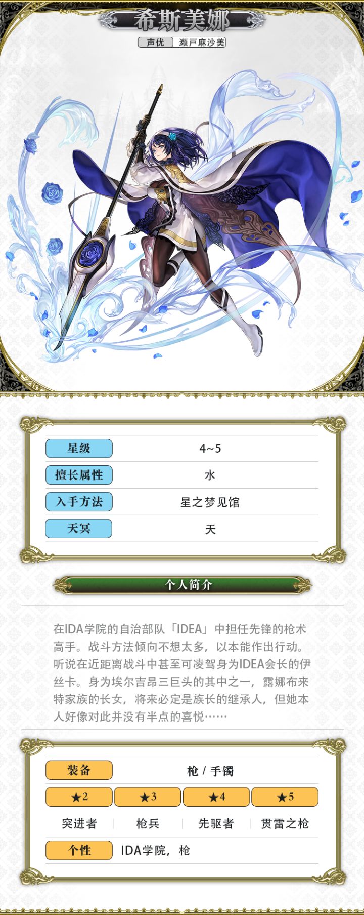 LV1-【要尝尝我身经百战、苦练而成的技艺吗?】给予全体敌人水属性突攻击(小)+物理耐性10%DOWN(1回合)LV2-【我会好好证明……自己的力量!】给予全体敌人水属性突攻击(中)+物理耐性15%DOWN(1回合)LV3-【前往这柄枪指向的未来!】给予全体敌人水属性突攻击(大)+物理耐性20%DOWN(1回合)固有技能【笼中鸟】魔法值:22给予单一敌人水属性突攻击(小)+自身暴击