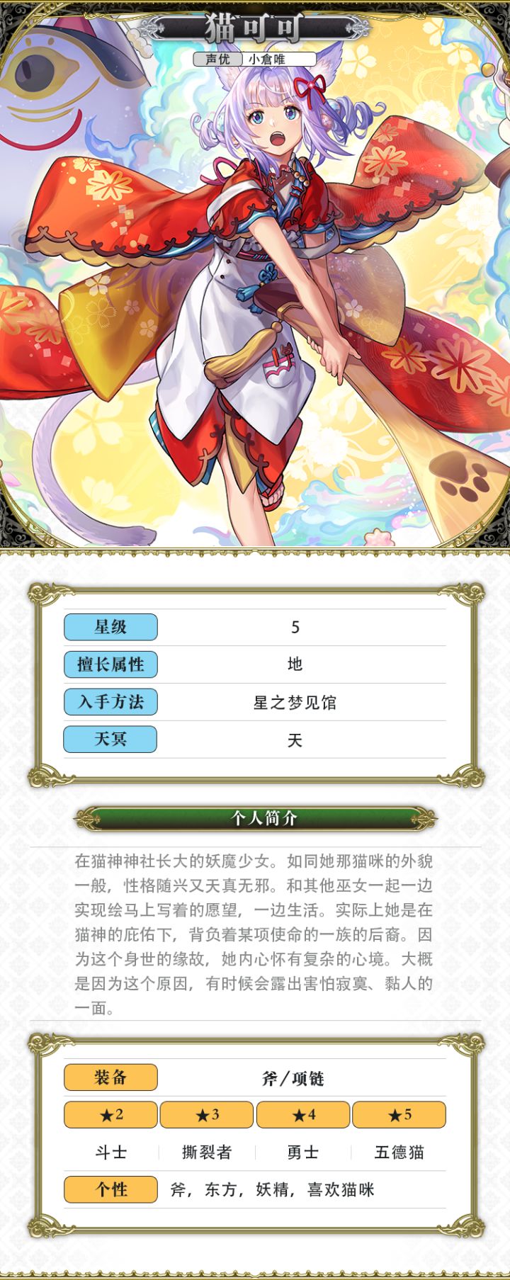 LV1 - 【这可会让人想大展身手喵!】展开地裂阵+我方全体暴击时威力30%UP(1回合)LV2 - 【让本猫可可好好款待一番喵♪】展开地裂阵+我方全体暴击时威力40%UP(1回合)LV3 - 【万客云集!大家快来喵♪】展开地裂阵+我方全体暴击时威力50%UP(1回合)LV3 - 【万客云集!大家快来喵♪】(VC灵晶强化)展开地裂阵+我方全体暴击时威力50%UP(2回合)固有技能【