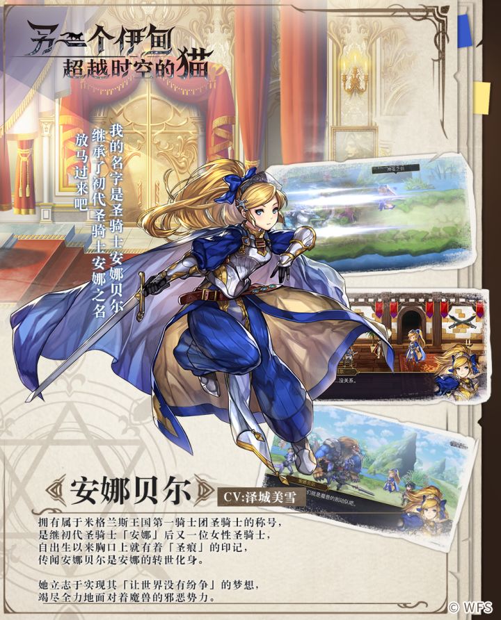 安娜贝尔是在外传《王国的骑士与祈愿的魔剑》中登场的5星角色。她是隶属于王国骑士团的强悍女骑士。兼具出色的武义与忠诚的内心,被王国赋予“圣骑士”的称号。在出生时胸膛上就显现出圣痕,相传是初代圣骑士安娜的转世。年幼时,魔兽毁灭了她的故乡,作为当时唯一的幸存者,得到救助的她如今也竭尽全力讨伐恶之魔兽。