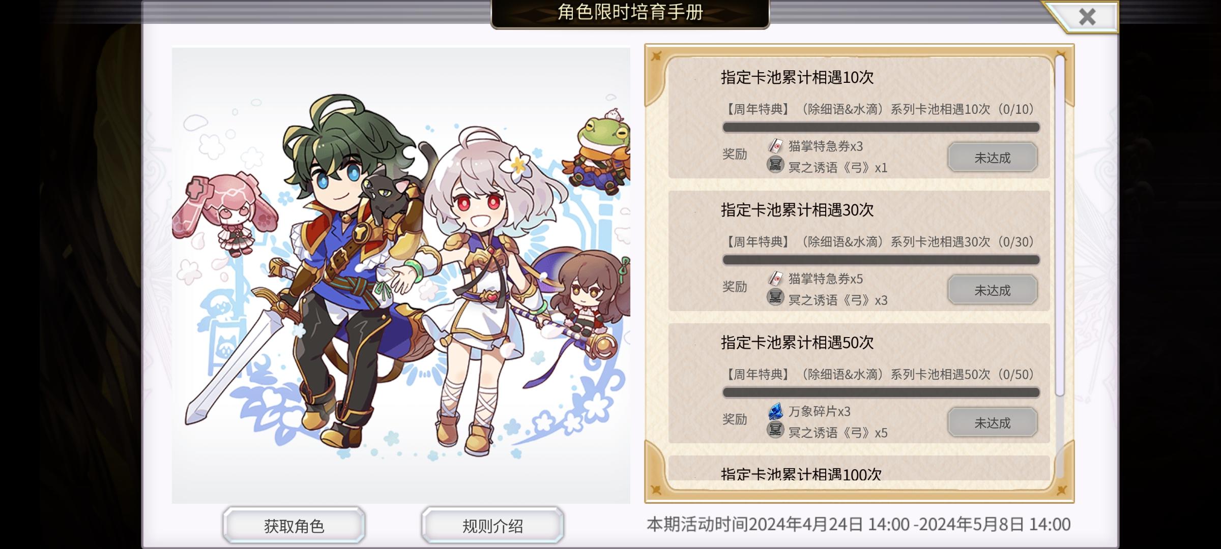 大伙,想问个事我是24号晚上6点左右抽的池子,按道理这个角色限时培育手册得累计?抽的是阿尔玛的池子,不是那个水滴每天免费十连