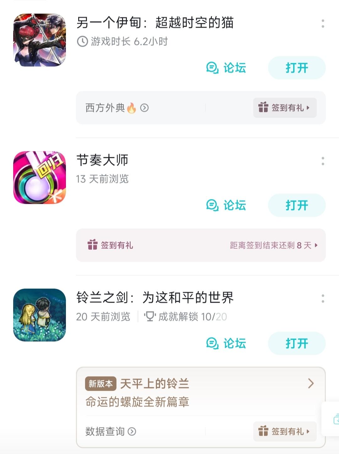 我这个猫游的游戏时间本来是正常增长的,之前一次更新(大半年左右,忘记是游戏更新还是tap更新了)把这个游戏时间归零了,之后就一直卡在6.2小时了,有没有大佬帮忙看一下怎么让它回复正常。。。还有就是有的游戏显示游戏时间,有的游戏显示上次浏览时间,这个要怎么设置呢?