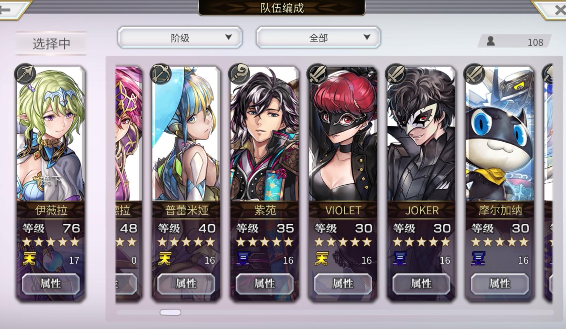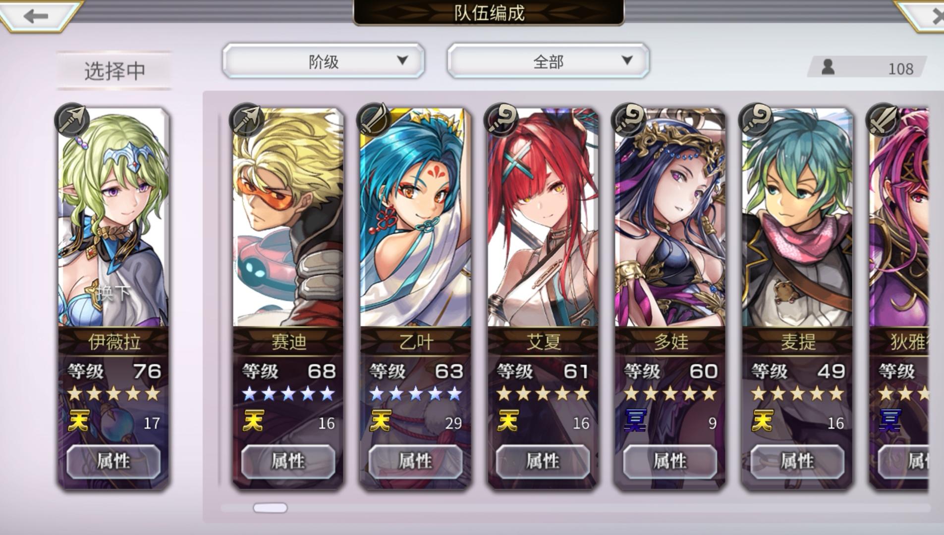 又过了两个星期,这个游戏不知不觉也玩了快一个月了这两个星期抽到了几个新的五星角色,求大佬们建议一下现在的队伍如何调整论坛里看到很多人说乙叶和这个紫苑很厉害,但是不知道适不适合我其他几个角色,现在打算是把伊薇拉或者泽伟罗换掉 ,大佬们看看换哪两个比较好