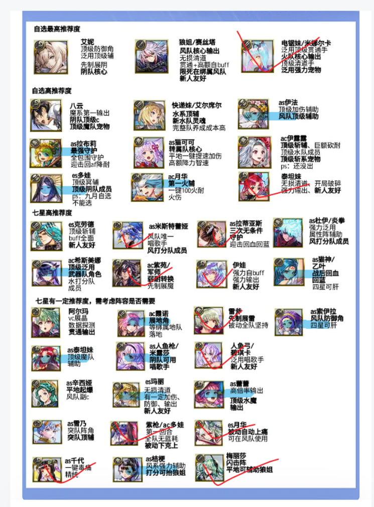 回坑不久,国庆的自选还没用,大佬们看看我选哪个比较好啊。 打勾的有了,蓝色横线的可以肝。谢谢啦(周年庆应该也会充点)