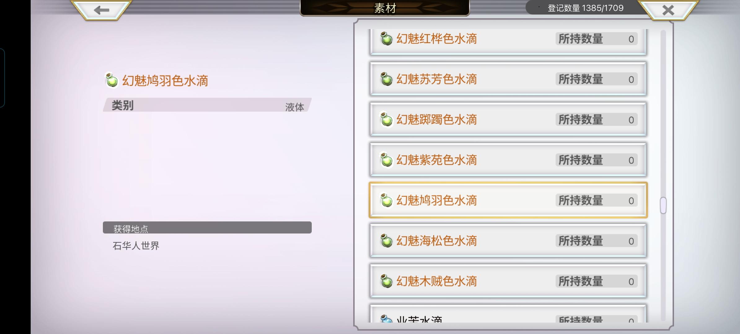 楼主好不容易把素材打完了,结果这个“幻魅鸠羽色水滴”死活整不出来。在论坛搜了攻略(不得不说这攻略真的偏门)后,攻略里有大佬发了汇总图片,图片里是日文,然后我又查了几个日语假名字体,翻译后知道是通过莱卡(普拉捏岛)获得的。可问题是除了那个外星怪兽二战我没打过,莱卡岛能点的我都点了,连对应的千年树武器都领了,图鉴里也显示有这个鸠羽色水滴,可获取数量就是“0”,到强化商人那里也强化不了。我之后又把