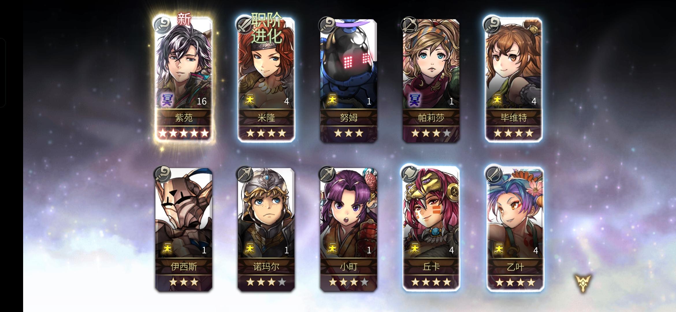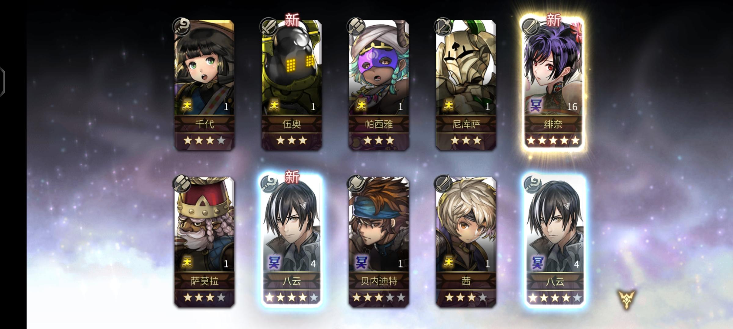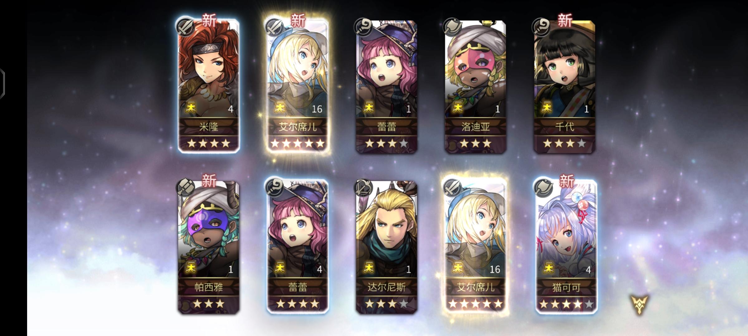 入坑第十一天,11号创的号,13号正式开始玩的,一开始抽到的艾尔席儿,中间抽到八云四星和拉帝亚斯,打到20章抽到泰坦妹和四星的电锯,电锯书下午打了6把就出了,后面想着推主线到55章,去推外史,拿五星冥,然后看到有主角团四星要求,以为会卡我很久,然后今天下午刷了5把就出了艾米的,一把就出了莉卡的,这下可以全速推进了