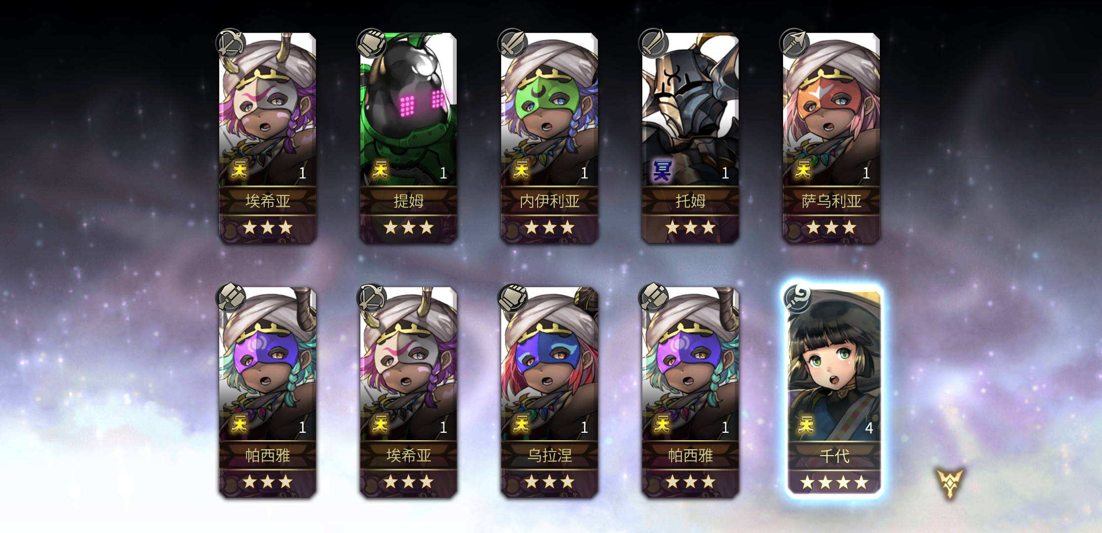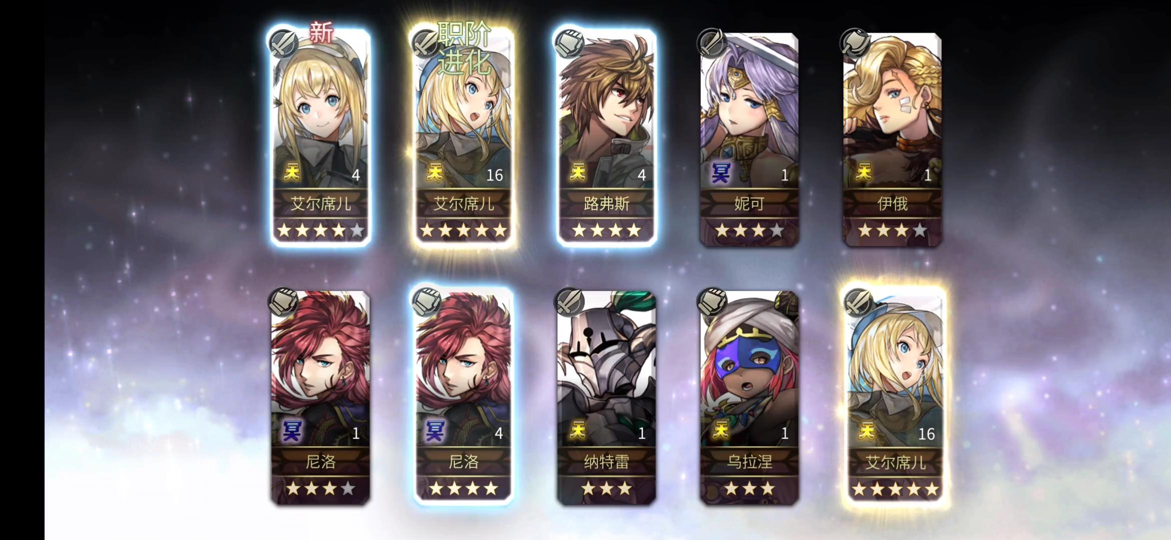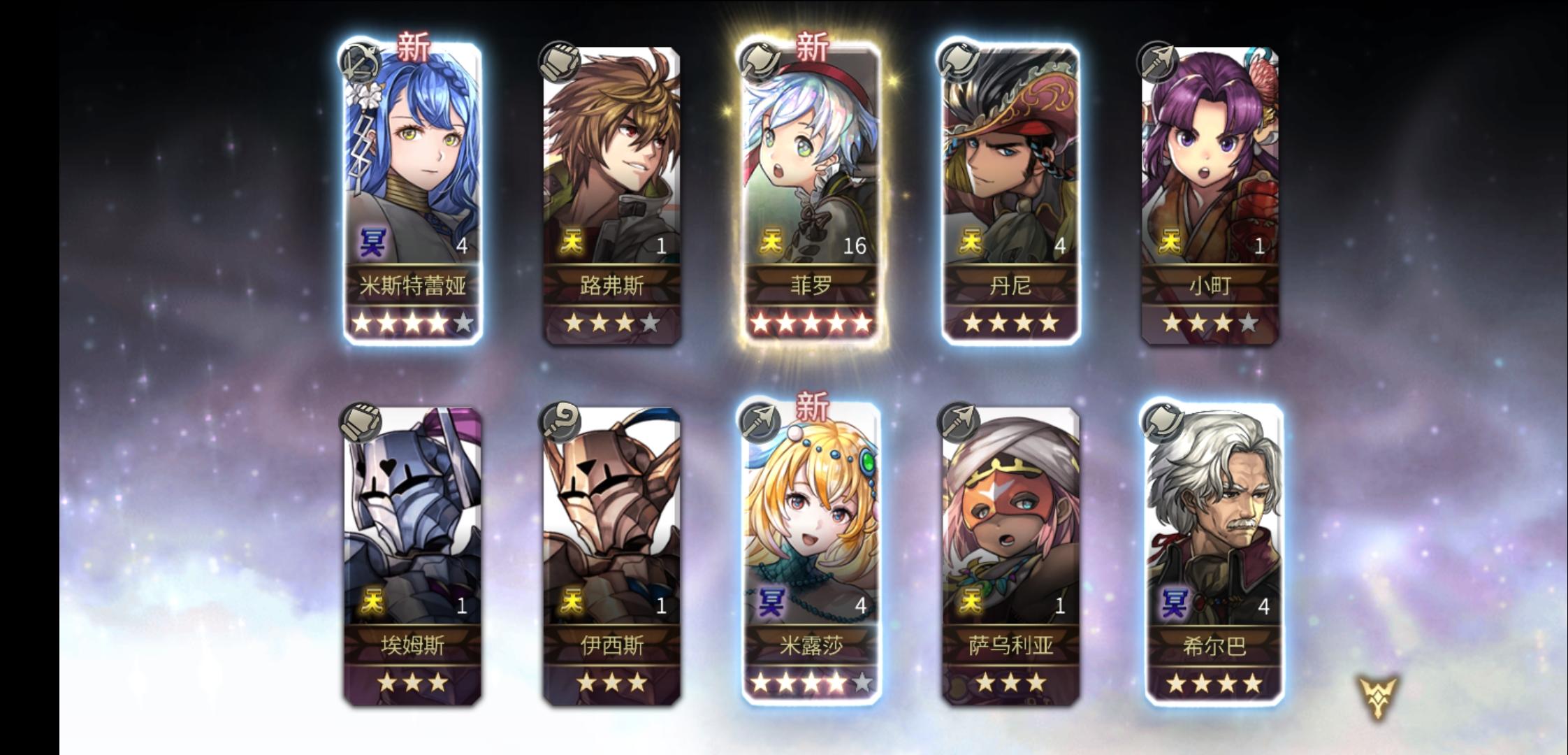入坑第十一天,11号创的号,13号正式开始玩的,一开始抽到的艾尔席儿,中间抽到八云四星和拉帝亚斯,打到20章抽到泰坦妹和四星的电锯,电锯书下午打了6把就出了,后面想着推主线到55章,去推外史,拿五星冥,然后看到有主角团四星要求,以为会卡我很久,然后今天下午刷了5把就出了艾米的,一把就出了莉卡的,这下可以全速推进了