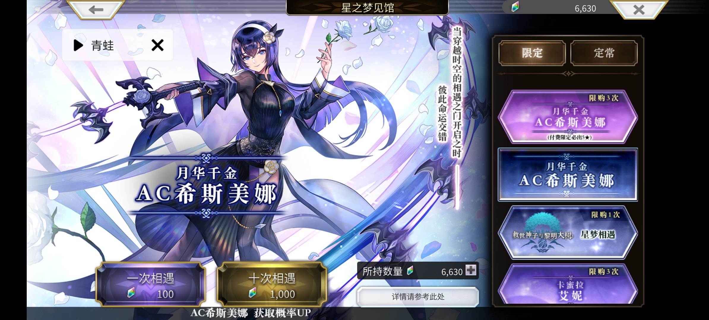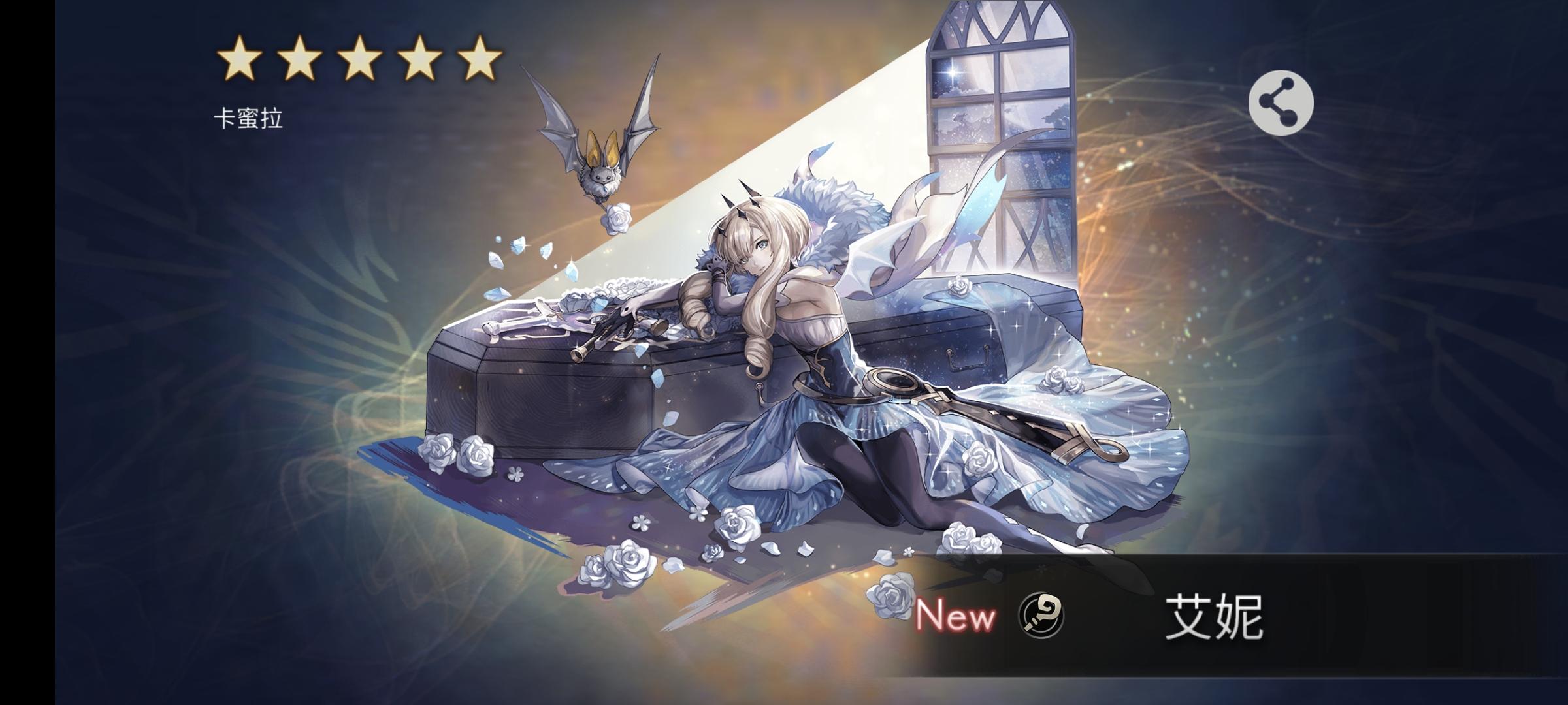你敢信两发就出了,我上次2000发出艾尼,这两天在弄普莱五星把钻石攒到6000,看到这个没想要的抽两发试试水,没想到单发第二发就出了