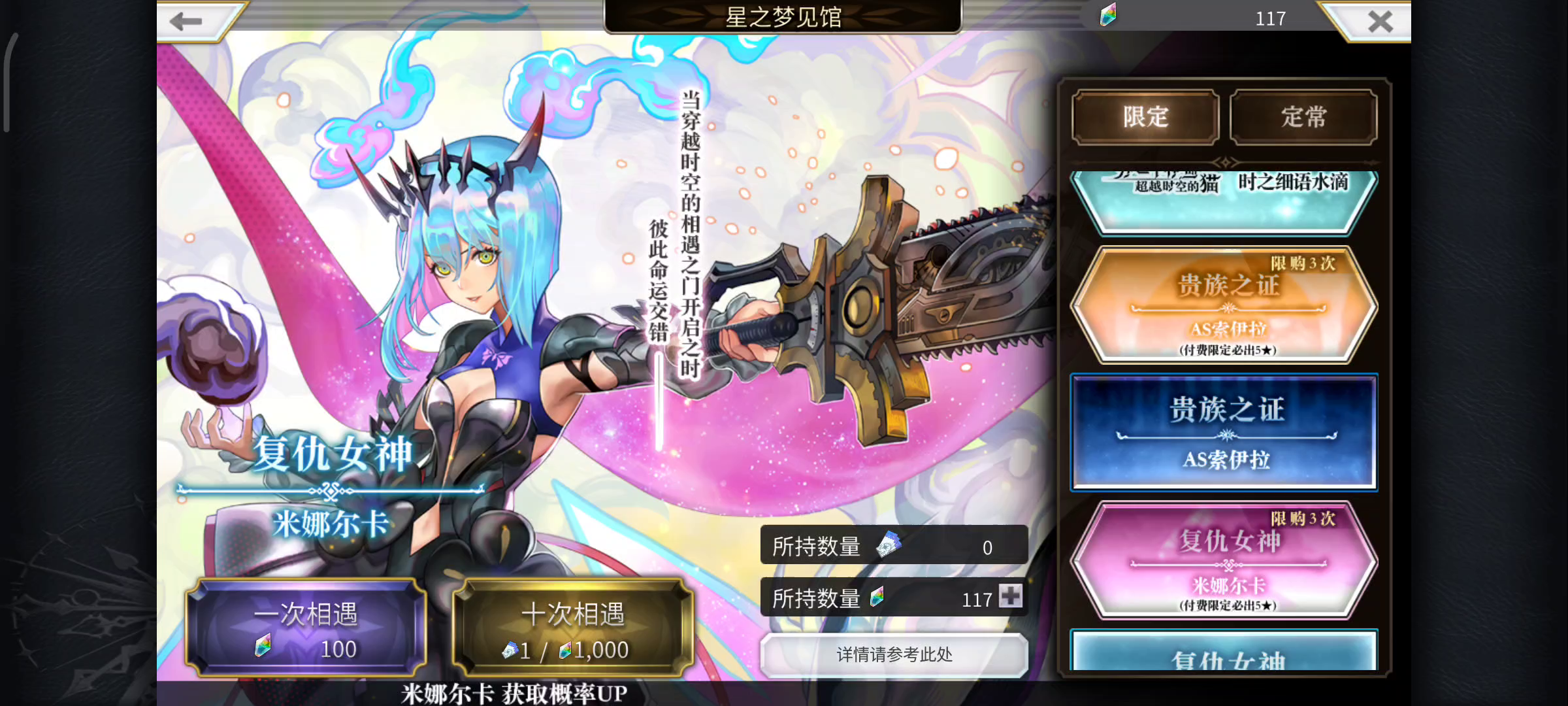 本来还想在电锯剧情还没出来时抽出她来过不同剧情的,奈何到昨天为止陆陆续续八千碎钻砸下去没听到个响。没办法活动期限快到了,我也只能从主线开刀弄碎钻了,然后过到91章领了两千碎钻一抽就出下图了。