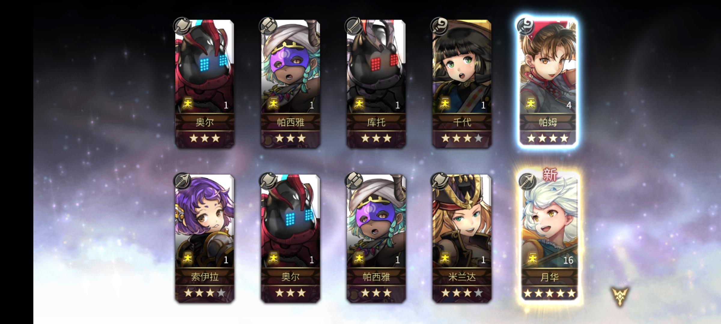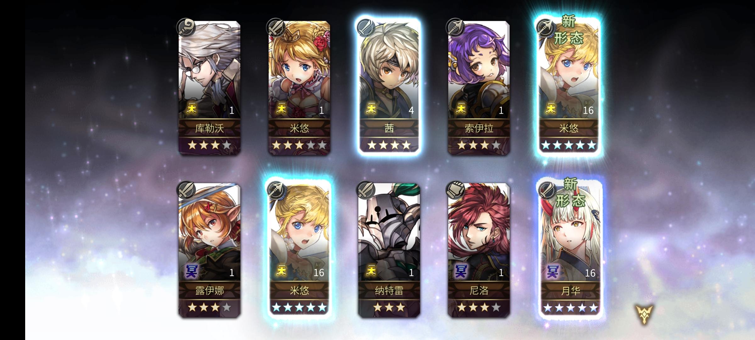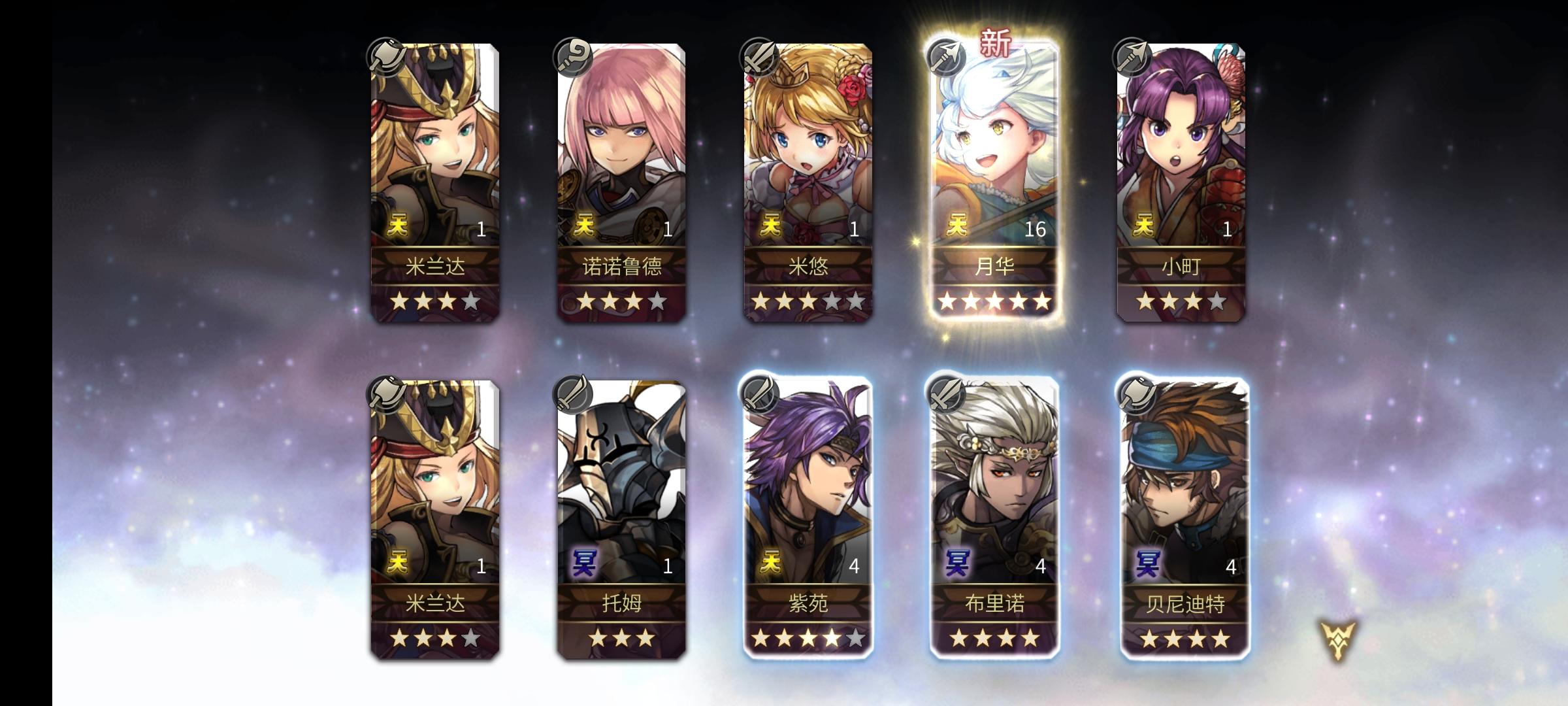 我看着中up的几率只有百分之二十,没想到一下子全出来了。不会是这种新手期容易出货,变成老咸鱼后就只有保底的套路吧。不过多了两个五星确实挺好的,我唯一一个五星是一个盾,打主线都有点吃力。这个叫米露莎的紫毛姑娘真好看,不知道能不能用来打伤害。