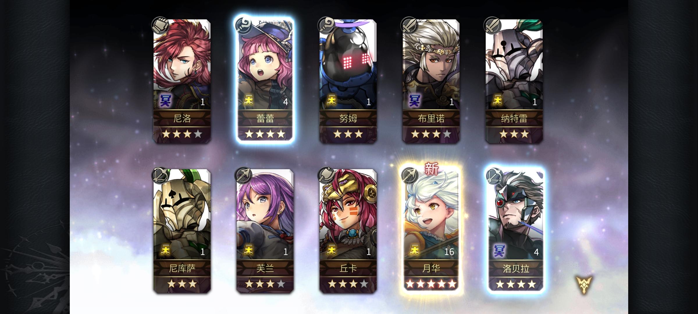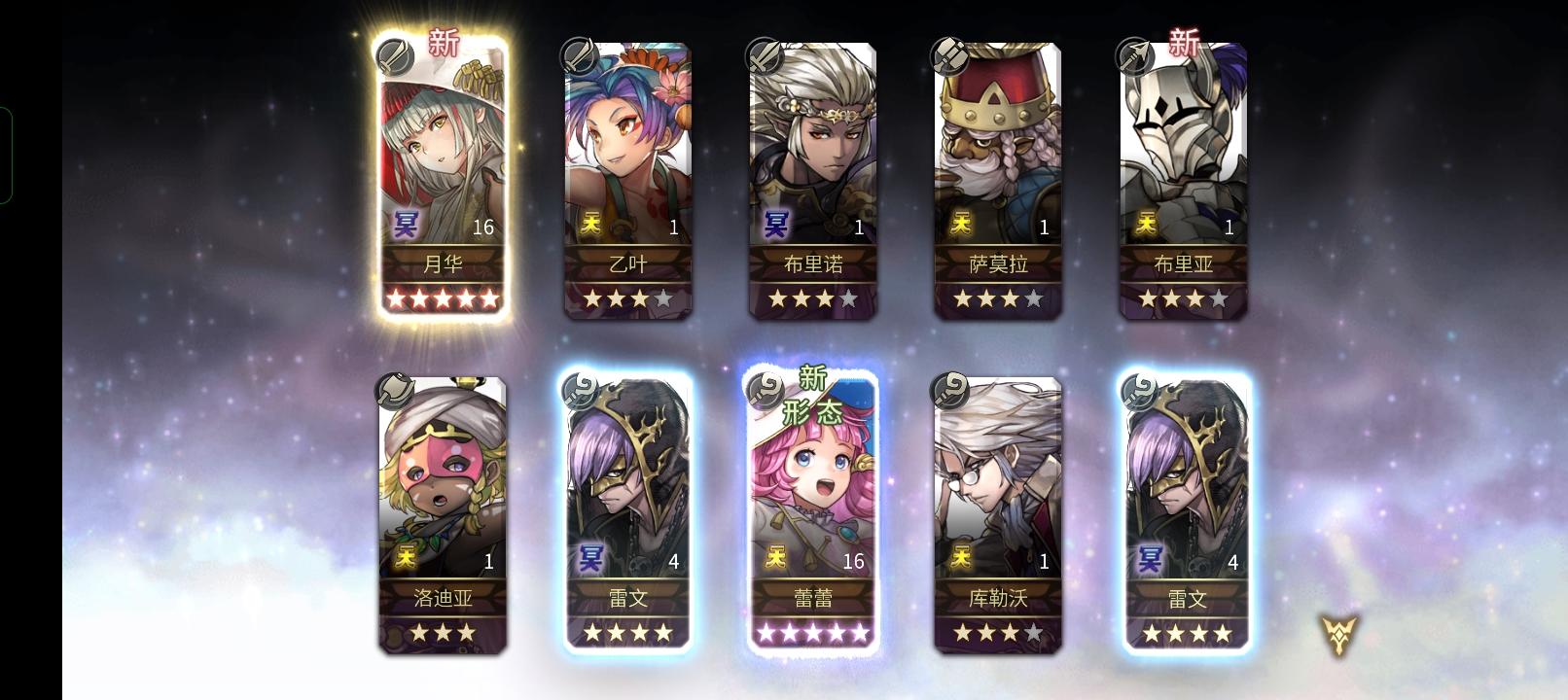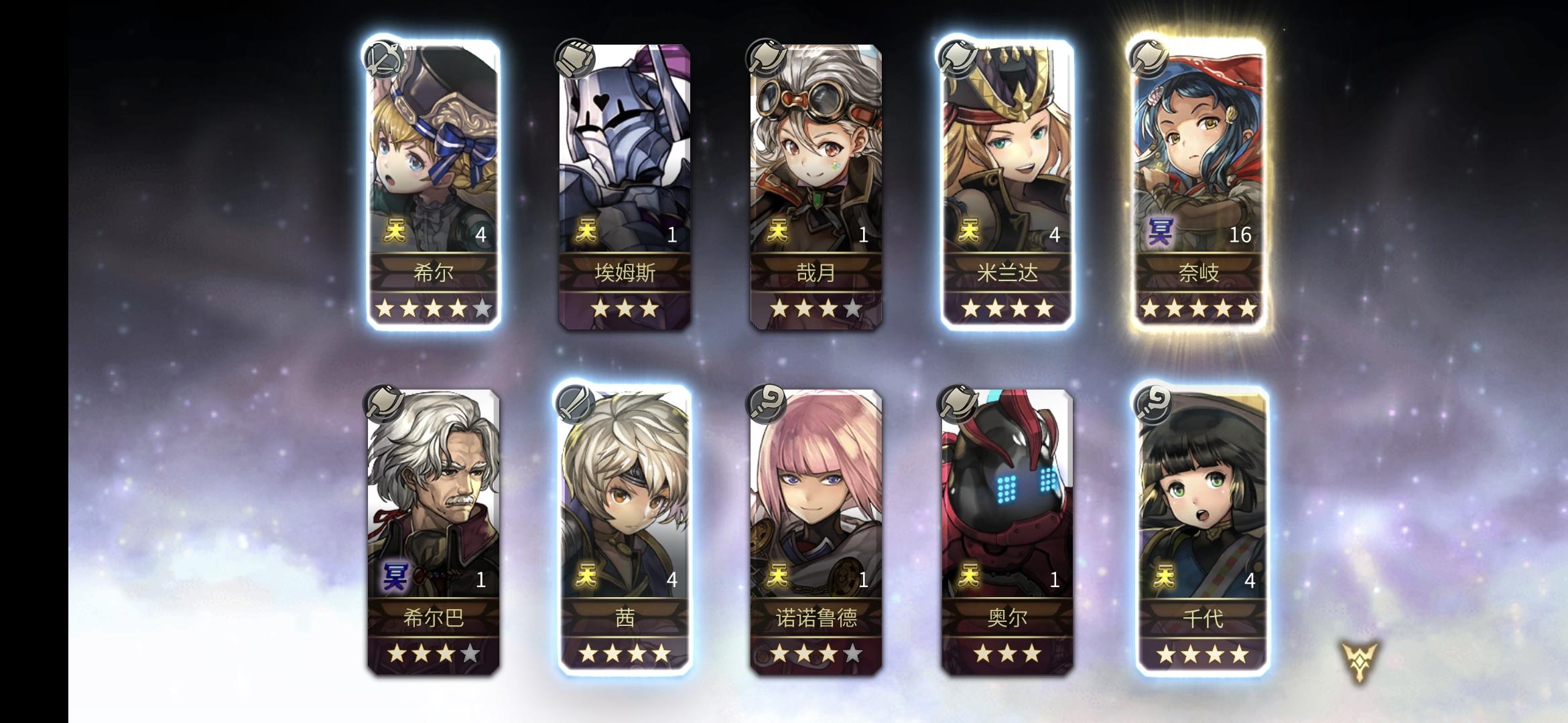我看着中up的几率只有百分之二十,没想到一下子全出来了。不会是这种新手期容易出货,变成老咸鱼后就只有保底的套路吧。不过多了两个五星确实挺好的,我唯一一个五星是一个盾,打主线都有点吃力。这个叫米露莎的紫毛姑娘真好看,不知道能不能用来打伤害。