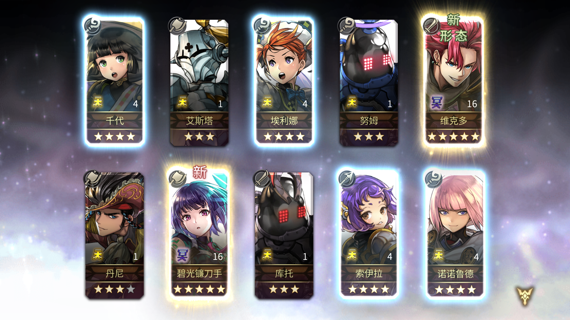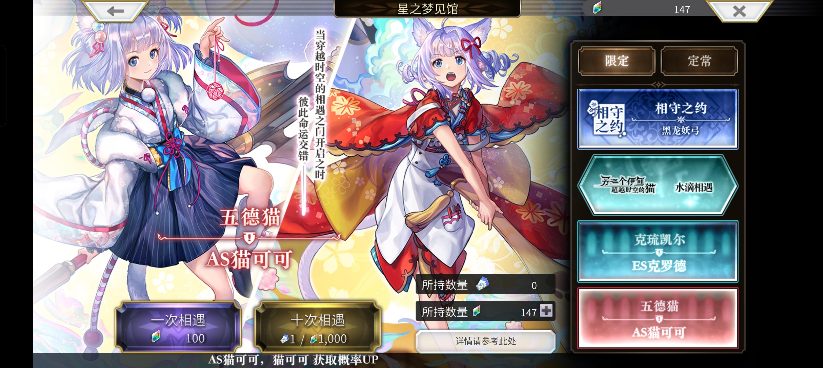 国王,猫猫免费1万,后面还抽了单次,反正全清光。就是不出啊,付费6000各卡池三次十连抽完。猫猫的AS形态不出,国王的ES形态不出内心崩溃,还好刷副本出了两个猫猫的异节换了两个,遇见了诗人。含泪内心酸酸的换了猫猫