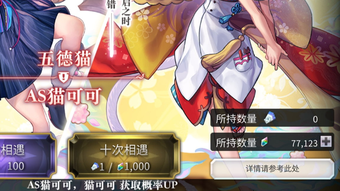 星梦池:金票池:猫猫契约池:as猫可可必五池:(有个ns大姐没截图)as猫可可免费池:(一次十连)祝大家都能抽出as猫可可哟