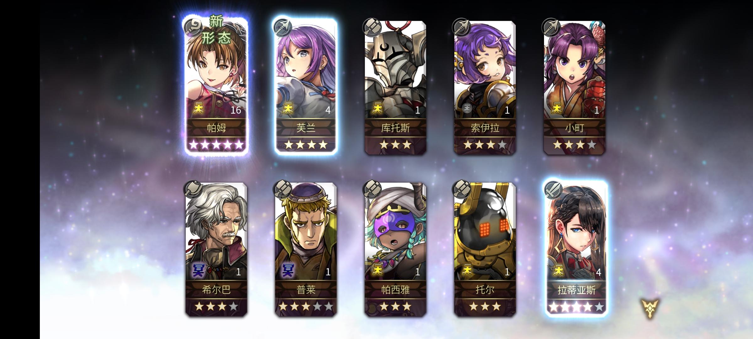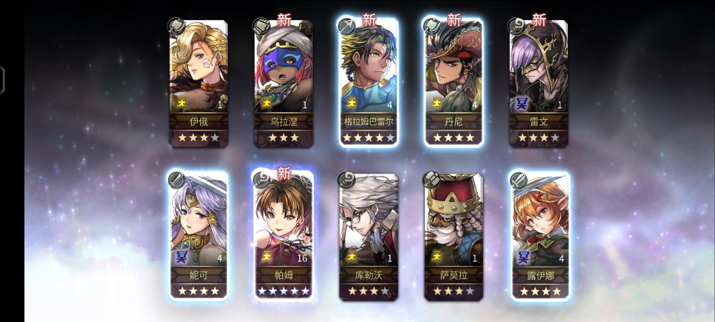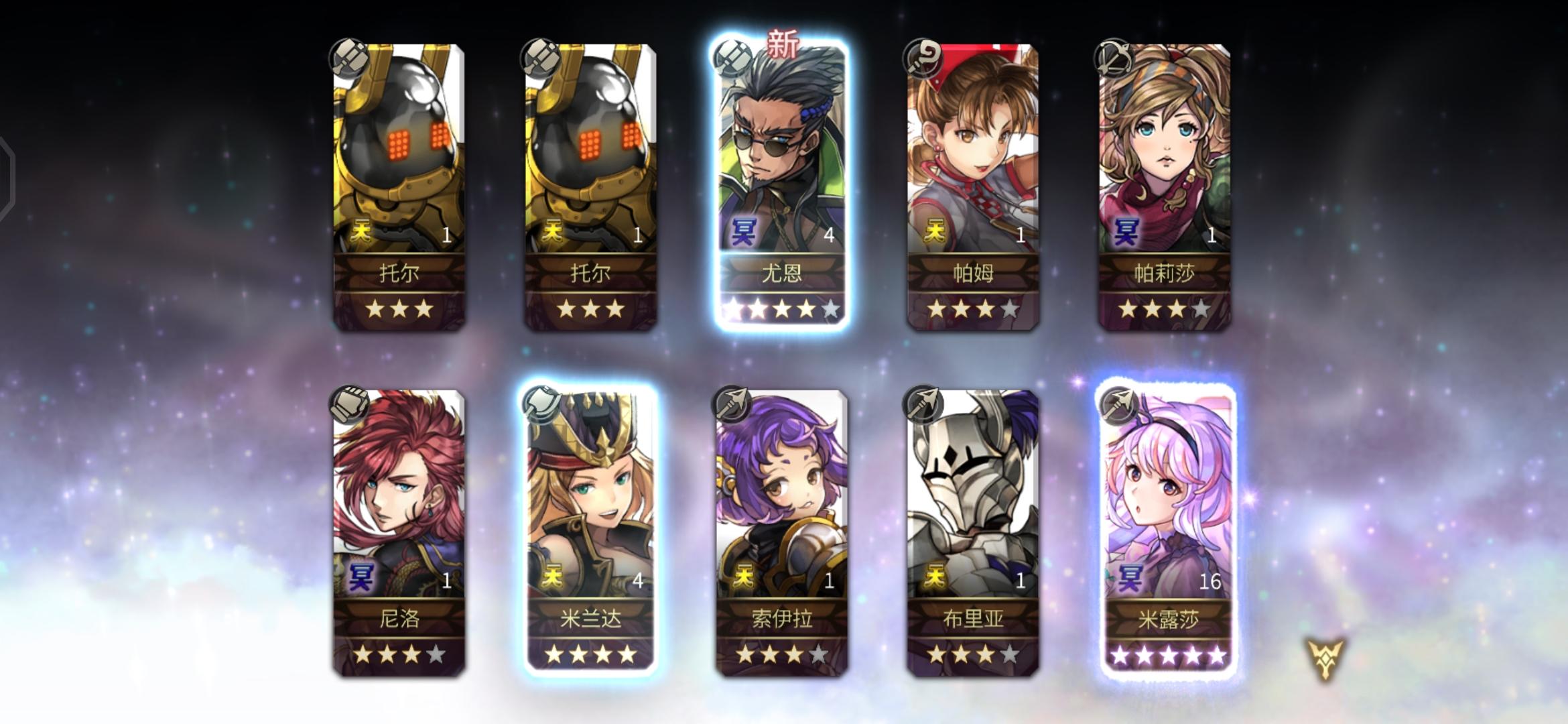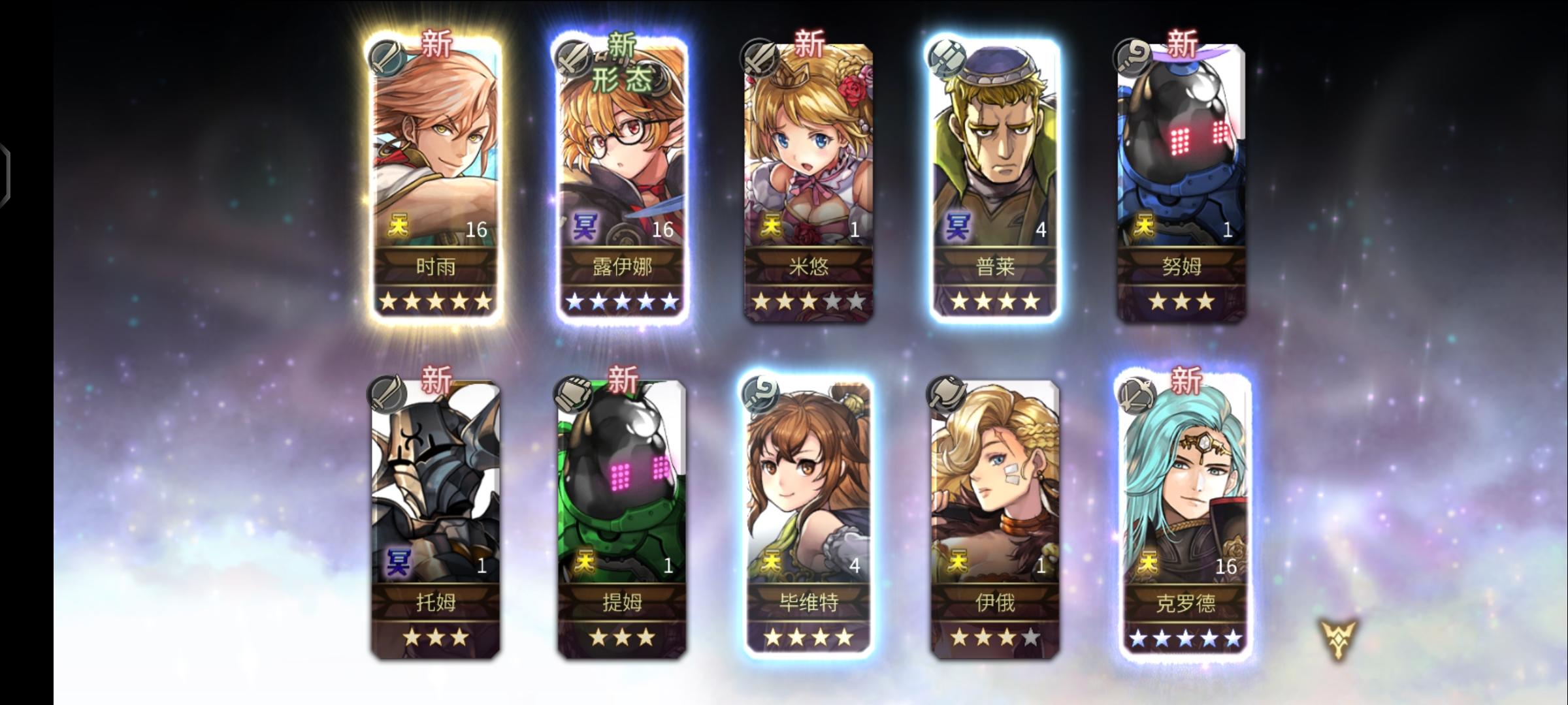 刚入坑半个多月,主线才打到30章,之前明芳两个10连就出了明芳一个5星,磕磕碰碰后面才有点上手会玩一点。攒了这么久钻看着异域10倍经验才忍不住抽卡了。。。还好还在萌新保护期
