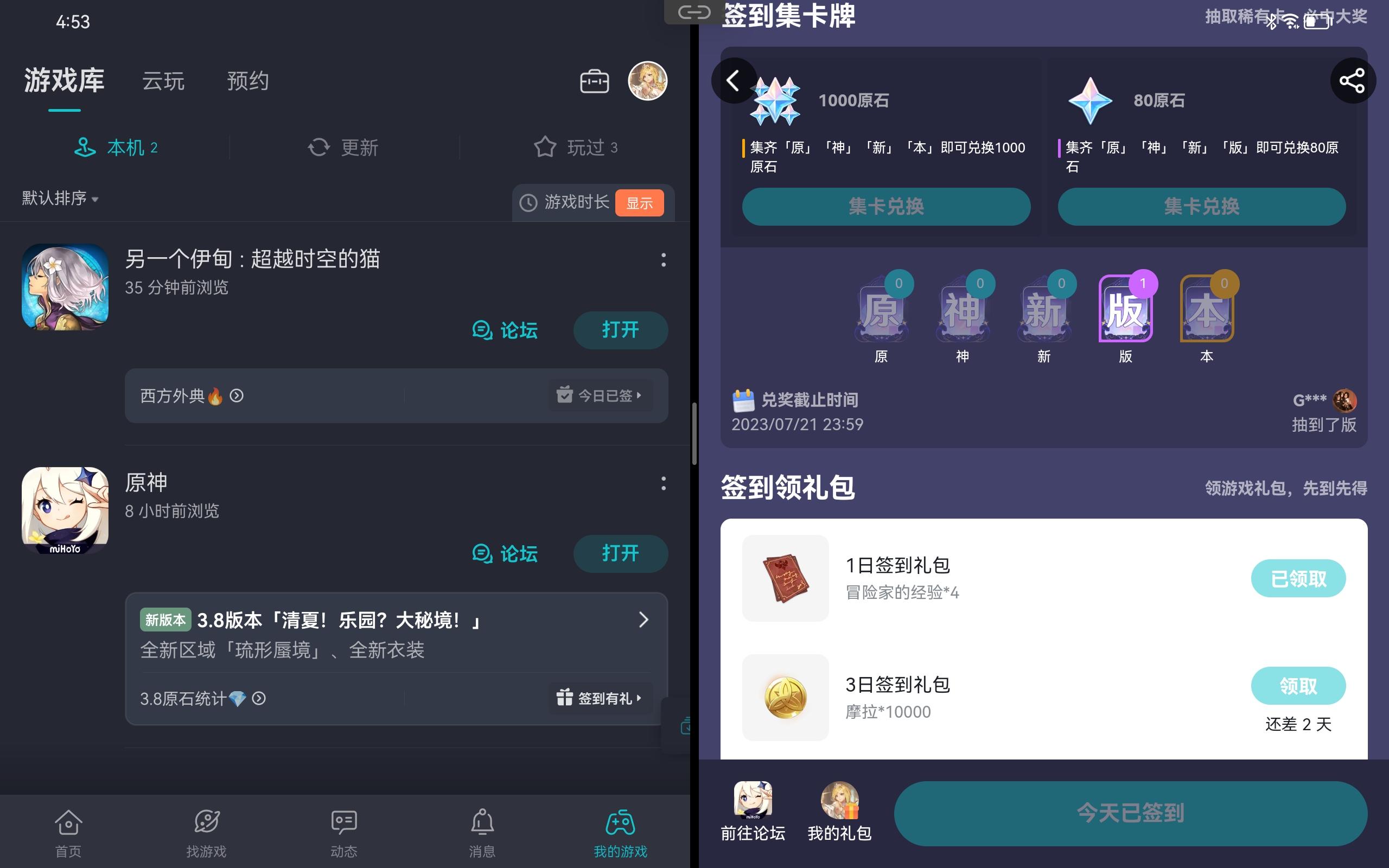 原神那边到是挺欧,第一发就中了,猫油天天都是重复蓝卡,论坛看了半天也没人中奖