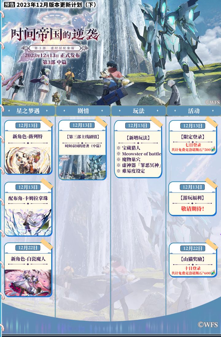 大家好,这里是菲奈!12月版本更新计划(下)来辣!第3部 虚时层轮象篇 时间帝国的逆袭 中篇 将在本次更新上线!新角色「薇列特」、「白瓷魔人」和配布角「卡姆拉拿珠」 在新剧情中与大家见面啦,新的主线剧情还将解锁许多新玩法,最让人期待的当然是将以高达形态出击的虚神器「罪恶冥神」!随着主线剧情的更新,必然也少不了菲奈为猫友们准备的游玩福利啦~大家可以在评论区猜猜会有哪些福利呢?明天揭晓答案!