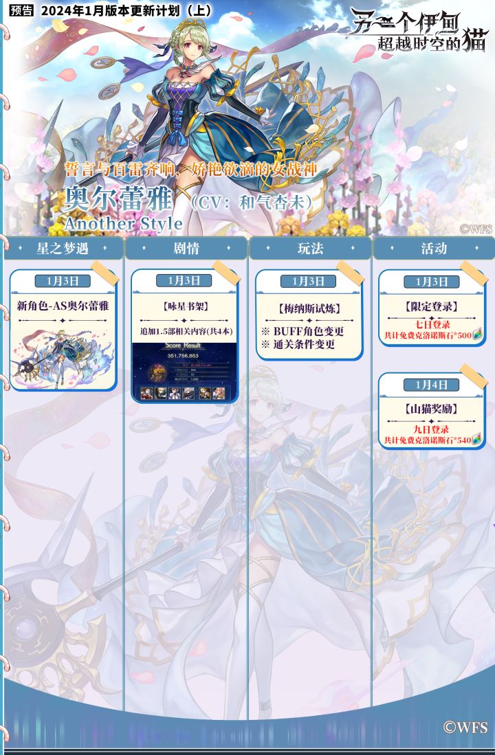 大家好,这里是菲奈!1月版本更新计划(上)来辣!新角色「AS奥尔蕾雅」将在本次更新上线!咏星书架也将追加4本1.5部内容相关的挑战,时间帝国的逆袭 中篇的平行迷宫-恩特纳也将在这次更新上线,欢迎大家前往虚时层进行挑战哦!