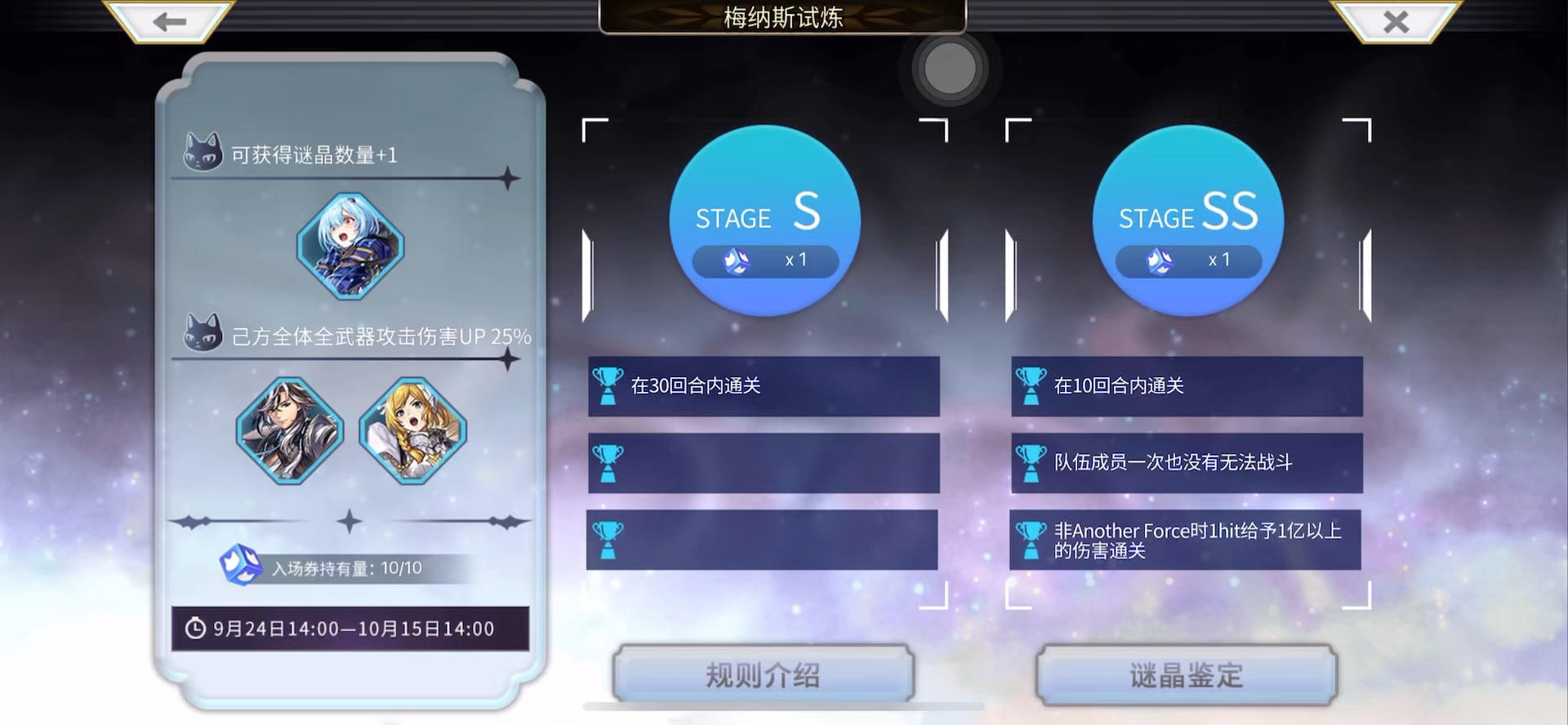 本周可上as赛斯塔es时雨伊斯卡阿鲁多,这4人配合完克伊斯卡誓约,本来想再减配狼姐的一个灵晶,然而再减3t内就打不死了,本周斩队主场,能上场的强力角色非常多,比上周的风水更轻松,我只用一个半残狼姐主C就速杀打过了,es时雨负责抗,伊斯卡和男主角负责负责大幅降物耐和斩耐,如果穿谜晶加满格输出装更是轻轻松松。