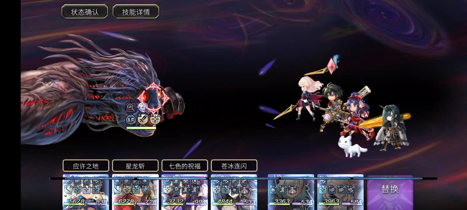 HP1500亿,3条命,速度300,斩突打无效,阴吸收,所以用ES猫可可附带弱点输出 开局清空AF,所以用AS阿鲁多补50%AF 前面2T攒满AF条是为了3T时BOSS的异次元外层消失,否则打不出伤害,每条命都要先攒满AF条 AS诺娜的真证很重要可防止吹飞2次 猫诺32 0琪12 AF:2221 1111....星3013 星0303,1112 1112 摩可技能换提特拉,AF:0221 2111