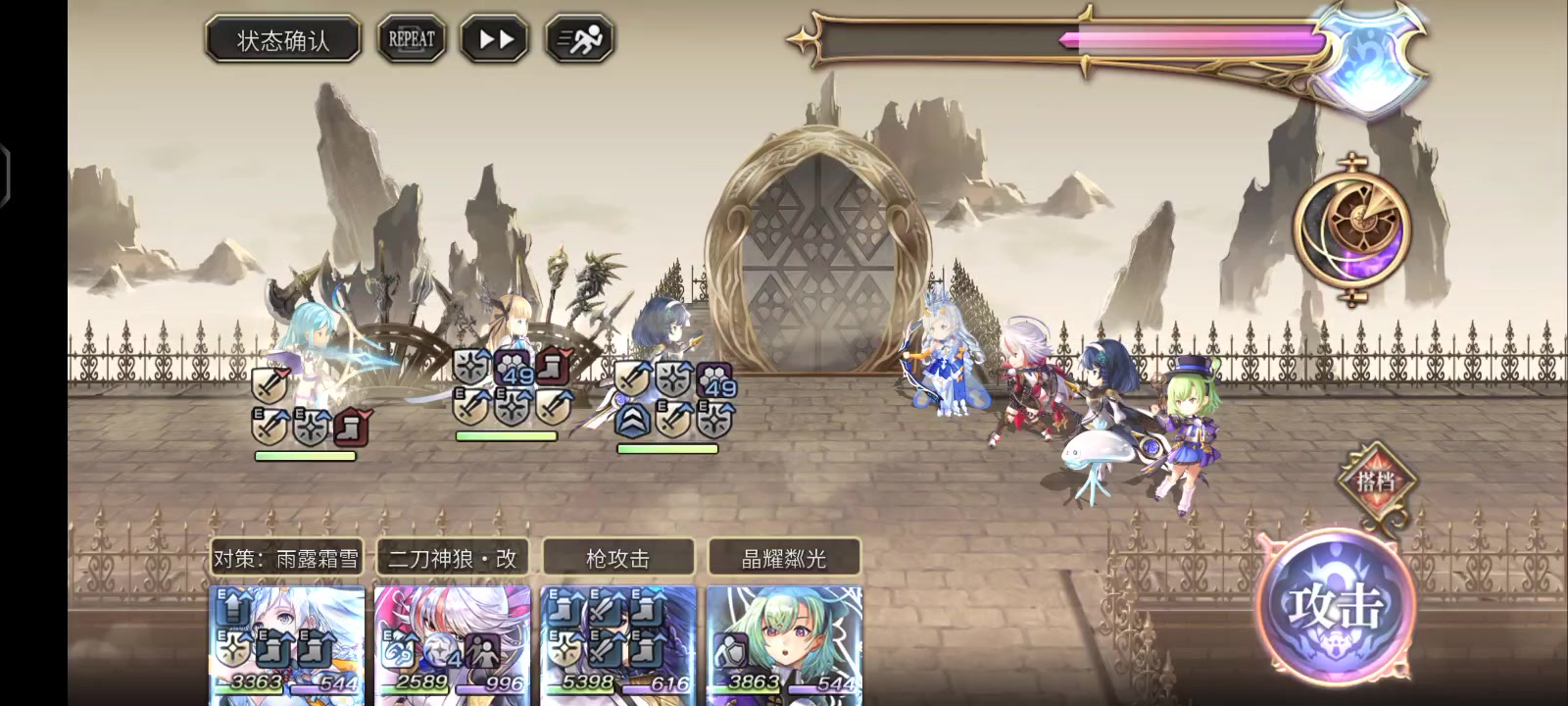 BOSS:HP6.7亿,速度303,弱火,物耐150%+魔耐150%+全属耐150% BOSS迎击时降全武器耐,1T雷2T地3T火 紫苑无需觉醒,1T用其他雷攻击替代