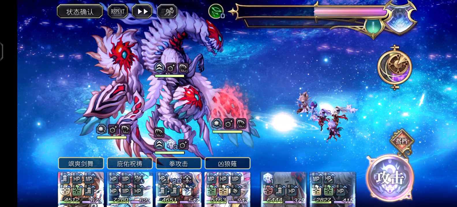 BOSS:HP1100亿,2条命,速度187,弱雷阴晶,常驻物耐中+魔耐中 受到毒伤害时降50%物·魔耐 开局50%减伤盾5回合 二命时清除debuff+破坏阵+展开水阵 二命锁血50%时加智力+破坏阵+展开水阵 1114 2TAF:3333 1111....星2232,第二次星4224 1211 4111 1111 6TAF:3333 1111....星2232,第二次星4224 1211 41