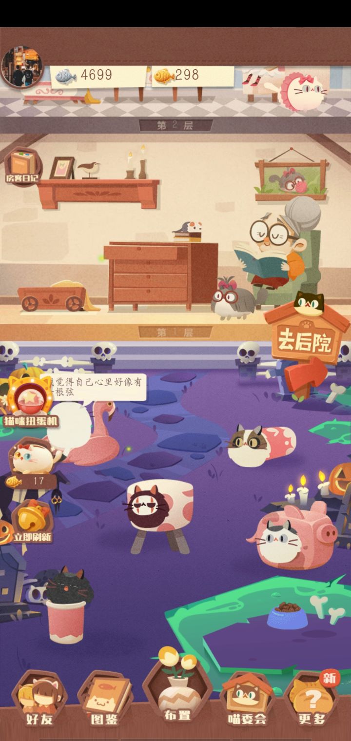 铲屎官们中午好啊🤗,我是布丁普天同庆,猫咪公馆更新了!这期讲解的是11楼房客艾莉莉,专属猫咪胡桃更新后打开游戏,划到11楼,可以看到新的楼层,花费5k金即可解锁(之前可是叮嘱你们好好囤小鱼干的哦)解锁新楼层后可以获得鱼缸和莲蓬两个新玩具,分别花费1k金解锁我们购买鱼缸放在草地上,可以吸引猫咪扑咚,扑咚可以给我们带来兔兔公仔,兔兔公仔就是解锁胡桃的关键呐将胡桃拖动到新楼层,11楼有点高,