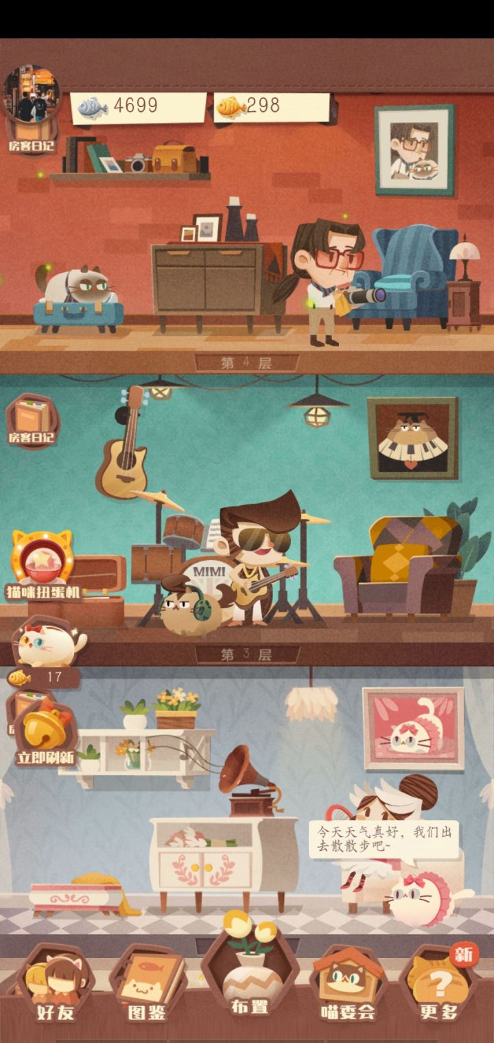 1楼是系统教学的老奶奶2楼的隐藏房客是米兰达需要的关键道具是红色舞鞋玩具引来的猫咪【爱丽丝】。舞鞋在玩具里面可以花费200银色小鱼干购买,然后在庭院里面摆上红舞鞋玩具,等着这只特殊猫咪【爱丽丝】的到来吧~ 爱丽丝来了之后把爱丽丝拖放到二楼内,米兰达就会出现啦。3楼的隐藏房客是麦克。杰克是一位摇滚青年,在创作歌曲上非常有天赋。 所以解锁杰克的关键就是乐谱了。乐谱的解锁流程如下 白色海绵球