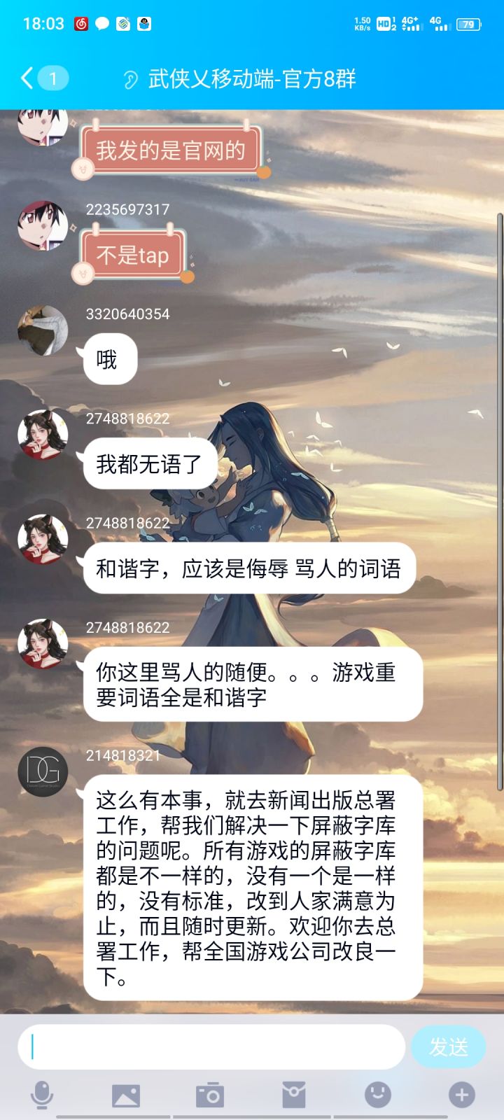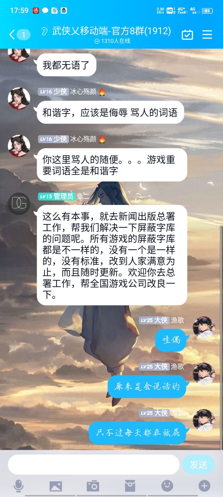 怎么说呢,就是鱼二大家都认识吧,当时武侠乂还没公测的时候,大家玩的都是很开心的,公测之后呢,就有各种各样的bug(也就是游戏日常),相信各位老玩家,也都深有体会,然后我们当然是要反馈的嘛,像鱼二也不会解决问题,一有问题就开始到处哔哔赖赖,然后出现bug只会去封号啥的,当然了,毕竟是小厂做的游戏,但这并不是你,拿着一个半成品,或者可以说是残缺的一个玩意儿,进去对广大玩家的一波割韭菜,游戏里面氪金,都是很正常的事儿,但是游戏做的这个样子,你们是怎么敢来圈钱的,我最后只想说一句话,就是你们tm的是有病吧,有病就去治,别拿着老玩家对你们的期待,最后变成失望!