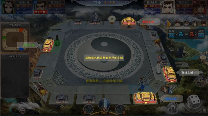 刚开始玩有点发懵?没关系,请让属下为主公讲解梳理。战局篇获胜方法非常简单!只要你和你的队友占领全部主城就可以啦!PS:红色的城池就是主城单挑篇双方各掷一骰,点数×10加武力之和比大小,谁大谁赢。上图项佐云武力35+4×10=75,关羽83+2×10=103 所以关羽胜!PS:数值高出50以上会俘虏对方哦!攻城篇武力×掷点数÷100(四舍五入)=每回合杀伤,智力高者先攻击。直到一方