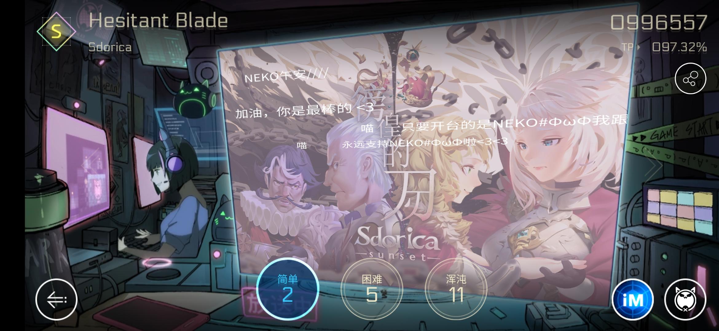 刚等过NEKO的bug修复 结果又在NEKO出现了问题歌还是在唱 但没有键位 而且条疯狂抖动总之是卡到这个界面了 条一直抖 歌曲是the spark 困难难度 希望可以修复一下