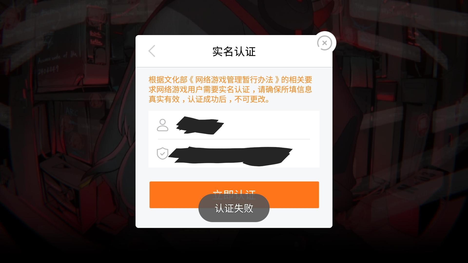 求大佬解答!不玩手痒痒今天上线突然就要实名了,逛了论坛才知道要防沉迷了。但是!为什么我名字 身份证都输入好了 检查了也是18位 注册账号的电话卡是用自己的身份证 年龄也超过18了 它却说认证失败???(如下图)不用qq 上一次因为账号的问题特地去下了,完事又卸了,如果每次出现问题要特地去找qq客服还真挺麻烦的。。而且也不像是我这边出的问题 (难道是要更新后吗?可是我怕更新后闪退orz