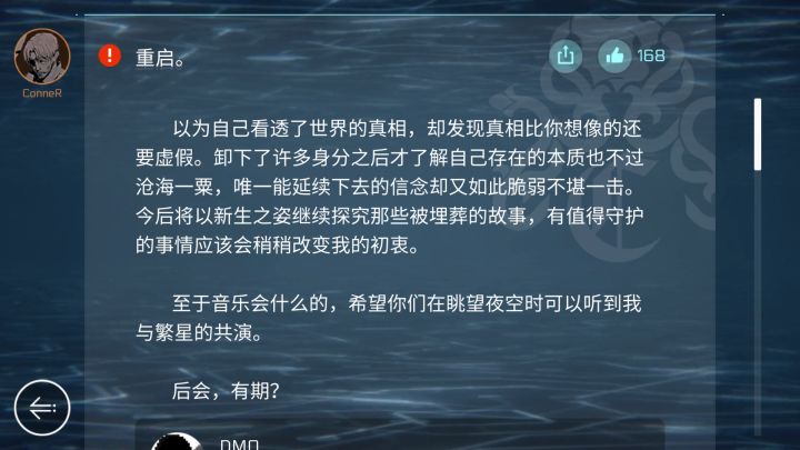 刚刚看到一个帖子说:true end 只是 Cytus II 的结局,不是 Cytus 系列的结局。不然为什么非true end里还会有后续的支线剧情,到现在连新人物都来了?再加上新剧情里有太多太多的伏笔,比如ilka坠楼之后的下落,3.0结尾最后Ivy的悬挂以及建造者大军,BoBo10级以后的Warner(警告者还行)。链接地址:总觉得事情没那么简单,再加上雷亚现在按部就班的在填坑,总觉