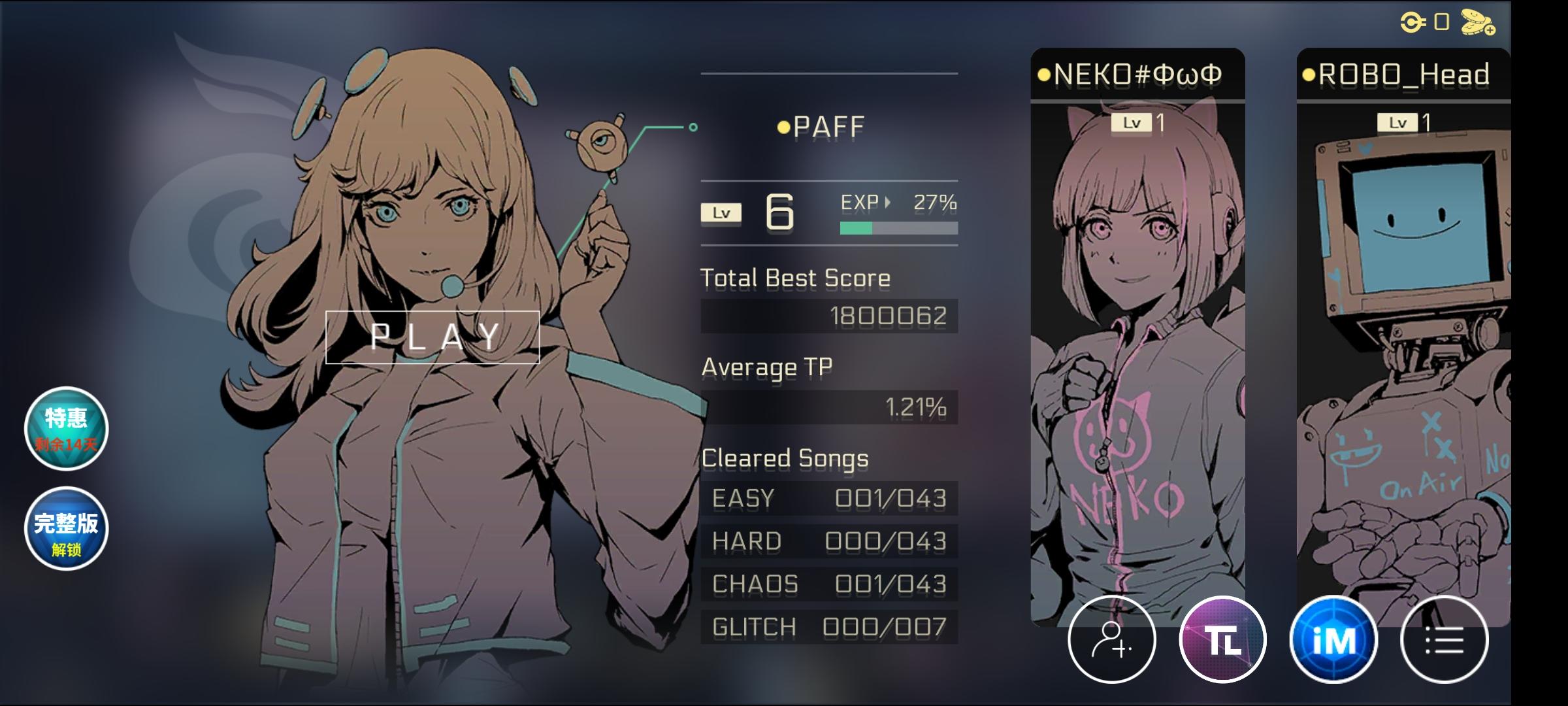 从tap下的限免,但是一直只能玩一只曲子,看攻略说是要过剧情,但是也没有找到,是要先把PAFF的等级刷上去吗?或者是界面左边有“购买正式版”选项,限免只能体验部分?