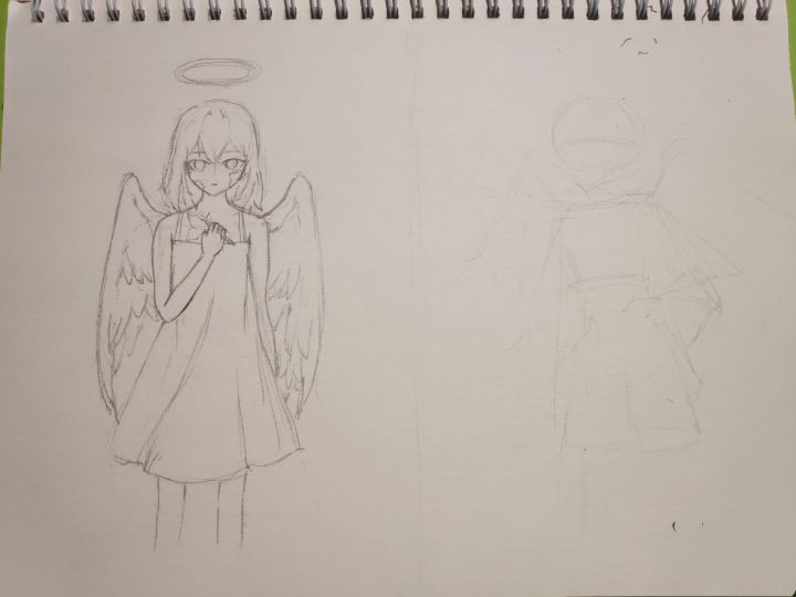 看见CAPSO skin的天使ivy当场就想到了天使与恶魔的常见搭配【幸好官图的ivy也没啥动态不然我垃圾的人体动态水平就hold不住了】先放草稿【不知道会不会勾线上色。毕竟草稿一时爽,勾线火葬场,上色也没想好是马克笔还是彩铅(马克笔确实难以把握),手绘党没有撤回键画错一笔跪着都要画完。。。】