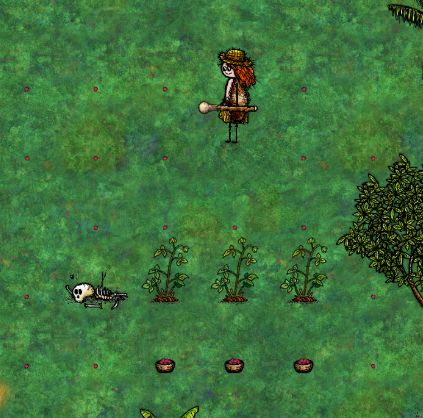这里以火炬为例说明众所周知把一个燃烧的火炬放在一个没人经过的地方,可以一直保持阴燃状态。以此可以推断出,一个可以随时间变化状态的物品可以永远保持第二形态(没有人经过及没有触发物品时间)。下面再举一些例子。(人物在物品变化前离开13格距离或死亡)摘完的醋栗(绿色)间隔5小时上线依旧保持棕色(第二状态)。慢火间隔5小时上线保持小火。浇过水的扦插枝间隔5小时上线保持未浇水的树苗。具体
