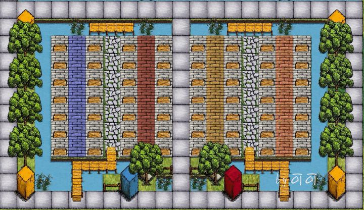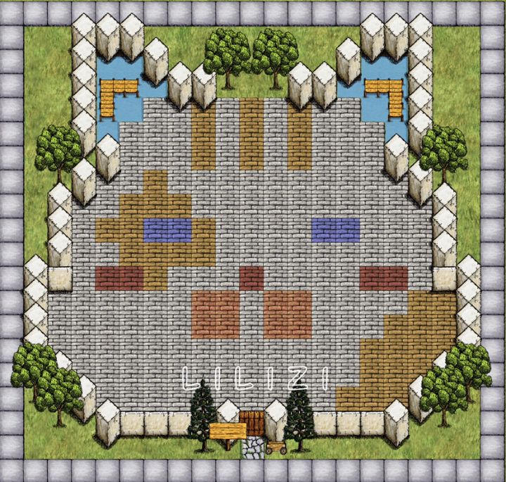 以前的蛋糕房 那时候刚刚更新砖和水渠,就打算铺一个房子形状。铺好后房顶想了很久不知道用什么颜色地板代替,总觉得颜色太多显得花哨。后面想到用水渠作为屋顶的蓝天。✨下面那排白色地板是小屋前的栅栏,蓝白地砖那里是蛋糕展示区。很喜欢这个建筑,退游前还专门给这里截图了。下面是我在国际服重新弄的设计图这是家里肝完了的图开工的时候总觉得左上角仓库特别丑,连改几个版本。一顿操作下来,最后还是选择了最