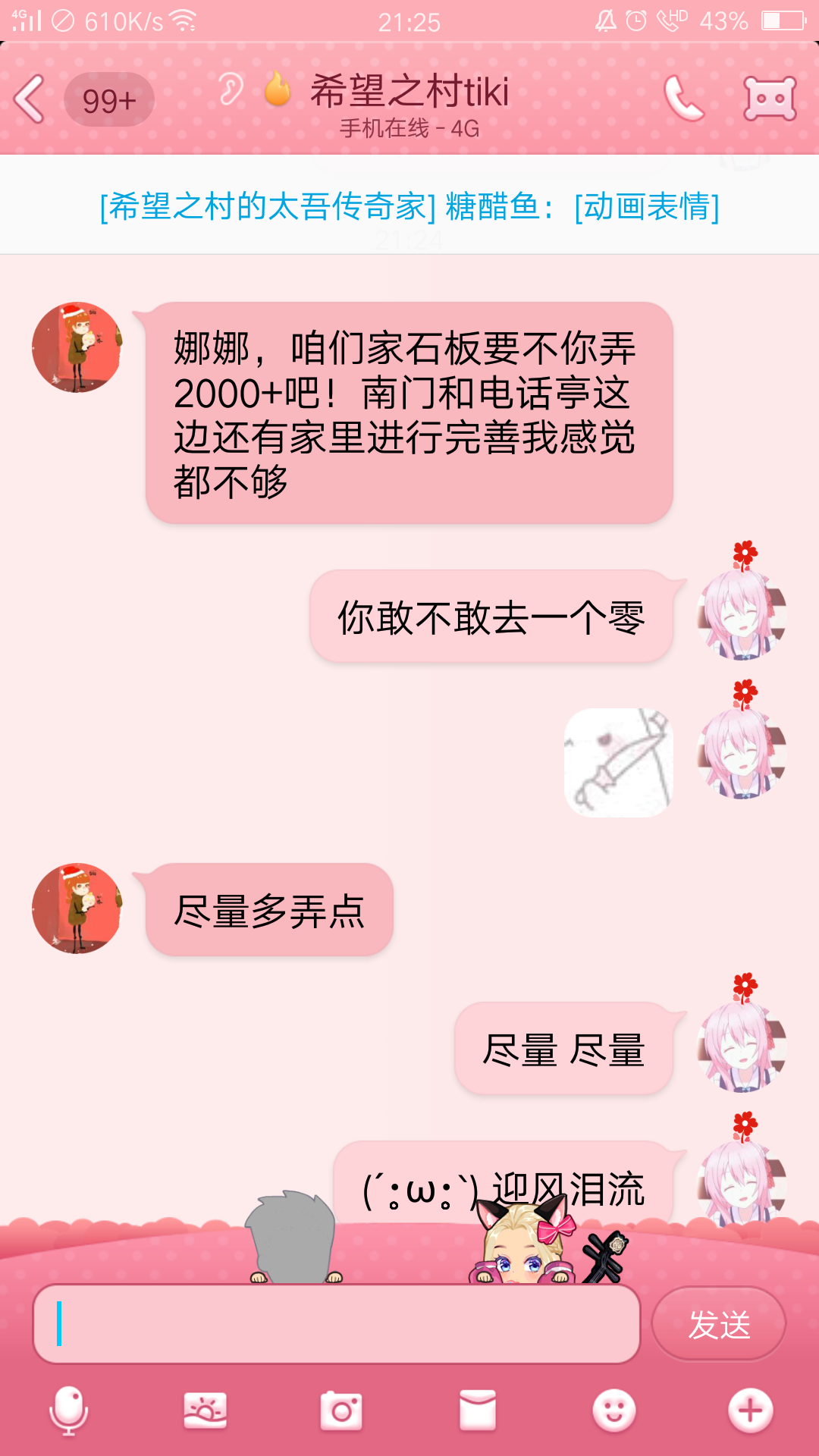 有木有那种有时间又乖(原意听话的那种,有礼貌的那种)的小可爱来我家呀~(不要太计较更好哦~我们家有敲钟陪走、设计一流(心虚)的我,又快又全能的不语,喜欢做饭的千千,提供技术力的小巩~还有一些小伙伴有时候不在就不多介绍啦。我们会一起聊天一起玩~不只限于此游戏哦~心动不如行动,加群原价999,现在一分钱不要 ,如果你愿意,有千千做饭,有我给你肝建筑,还有不语帮你哟~我qq1670659960,加