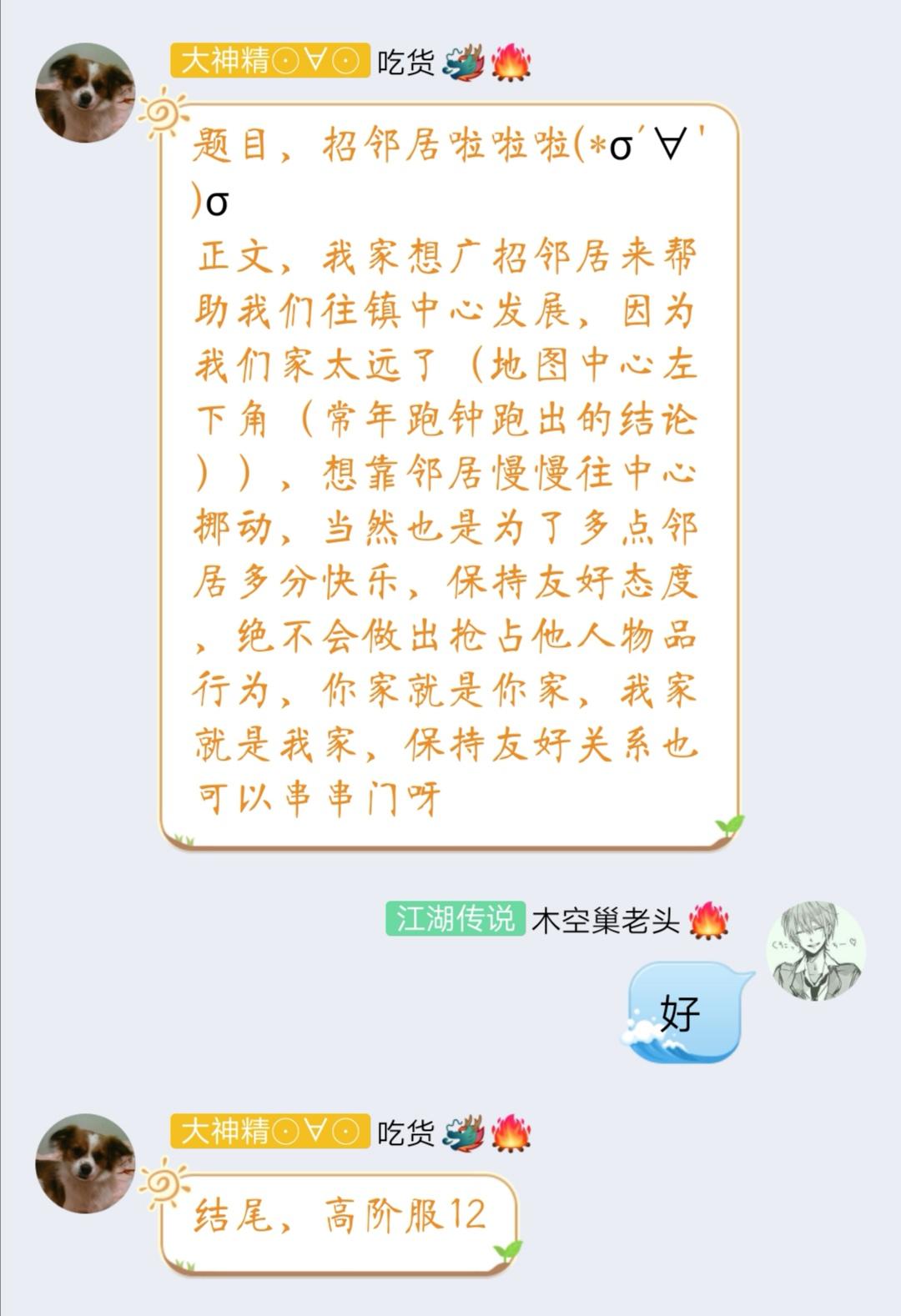 虽然有很多同服的小伙伴,但是因为我们家住在山旮旯里面,离镇子超级无敌地远,所以群主发话了说要让我上论坛招邻居,原话在下面那张图里面~群主还说了,跑到就送三乘三的铁和一整套铁具哦✧(≖ ◡ ≖✿)下面是群主的QQ:2224368305有兴趣的小可爱可以加QQ联系一下哦(´-ω-`)