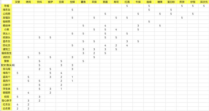 半个月重新玩了一遍直接上结论1红酒 咖啡 煎饼 炒面 异次元2意面 牛排 蛋白 糖果 炒面3生鲜 羊排 寿司 红酒 煎饼4生鲜 咖啡 蛋白 薯条 意面5红酒 咖啡 煎饼 炒面 异次元6生鲜 羊排 寿司 红酒 煎饼7意面 牛排 蛋白 糖果 炒面8生鲜 咖啡 蛋白 薯条 红酒具体数据直接扒的大佬帖子利润最高的七种顾客,前四种to,后三个搭头布局就很简单了一共有八条产线,四种t