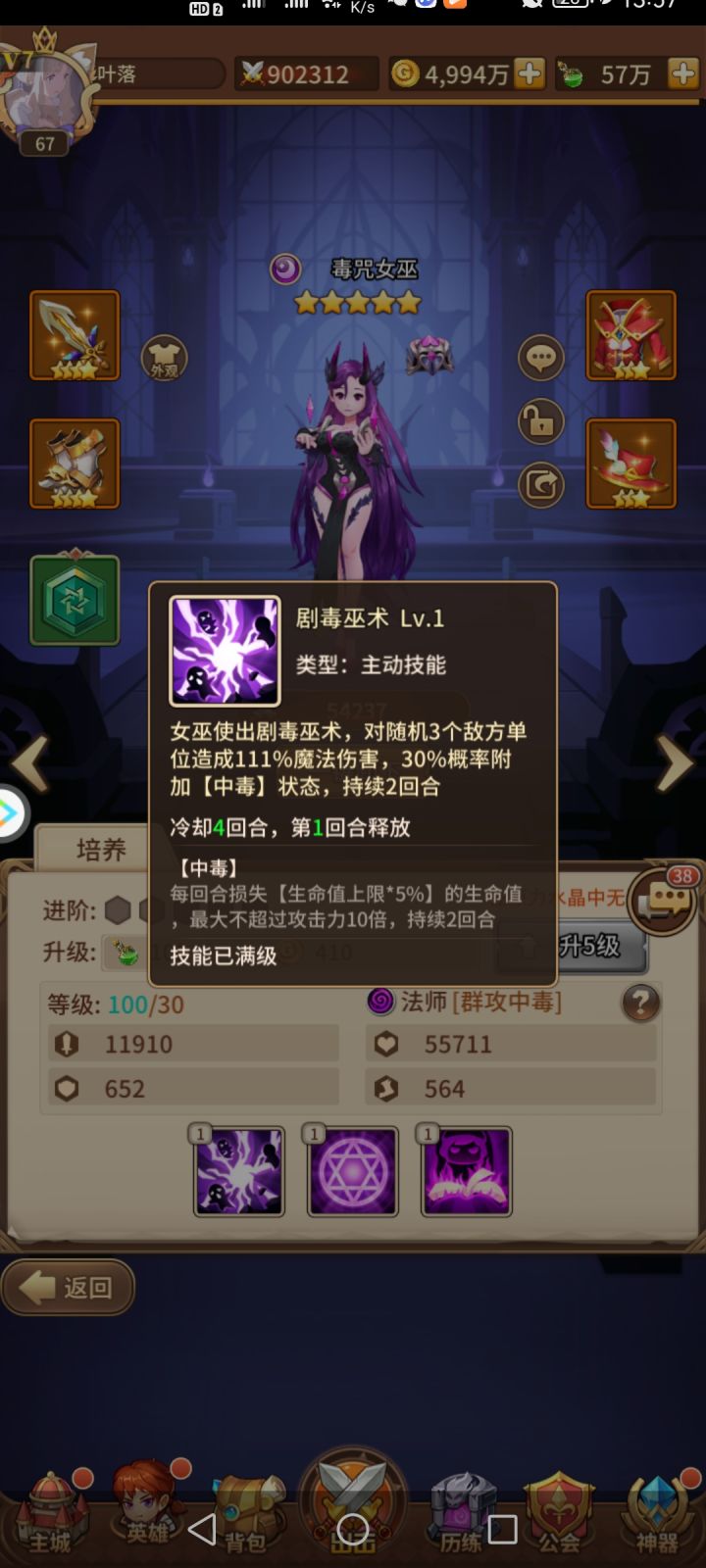 前期公会副本毒咒女巫的重要性!!!打副本养女巫就行人权卡给点装备就行收益高的离谱,只需要放原力水晶放养就行。每回合目标损失5%生命值最大不超过自身攻击力10倍,注意不是10%是10倍。不懂可以看下图伤害表比你主养的输出还高。