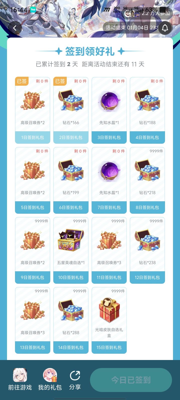 #闪烁之光 #签到活动 我知道taptap里有这个活动,之前也签齐了两轮,但是我不知道活动是从什么时候开始的,反正我月初的时候看了一下,没有,我就不看了,还以为没有这个活动了,于是这期就漏了几天,然后最近回来,发现又可以签到了,签到两天,礼包数全为0,而且又发现,3、4、5、6、7天的礼包数也为0了,这种活动设置,也就是说,能够领到礼包的,只有从第一天就开始领的那些人,我们这种晚了一天或者漏了一天