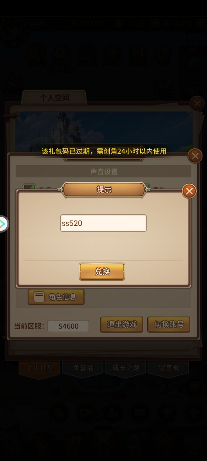 兑换码ss520有限制 创建角色一天内达到25级才能用我是前天半夜才下的,然后没玩几分钟到昨天凌晨了,睡觉了,然后今天玩的时候才想起来还有一个兑换码没换,我人麻了2328893