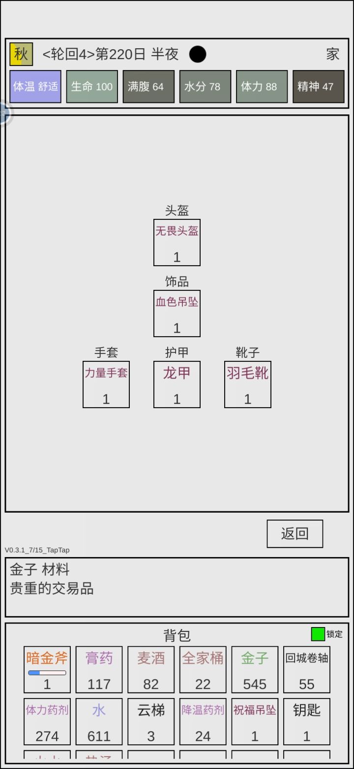 前段时间更新了一下,发现出轮回啦~那就玩玩看吧~作为一个万年近战格斗派,转生技能当然是选择了幸运儿,打怪掉落增加50%,毕竟游戏里绝大部分的资源都是打怪掉的嘛。转生之后只能带身上数量最多的10种道具,为了实现"转生后直接度过前期"的目标,我带的十件道具是全家桶/鱼羊鲜 果蔬汁 铁镐(至少300) 体力药剂 木头(至少3w) 金子(如果你攒不到30w那你就太弱了) 宝石 铁矿(至少2w) 零件