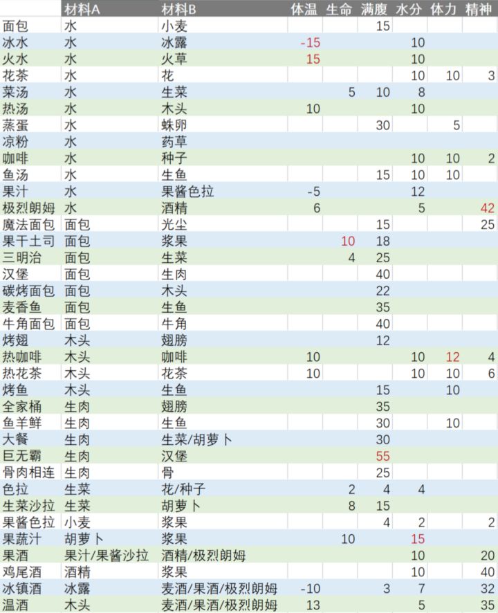 输数据输得头大。表中仅列出了我所知道的食物,并且不包括直接能够获得以及酿酒台酿出的食物。但还是好多啊啊啊啊等我什么时候有空了再把剩下的弄好