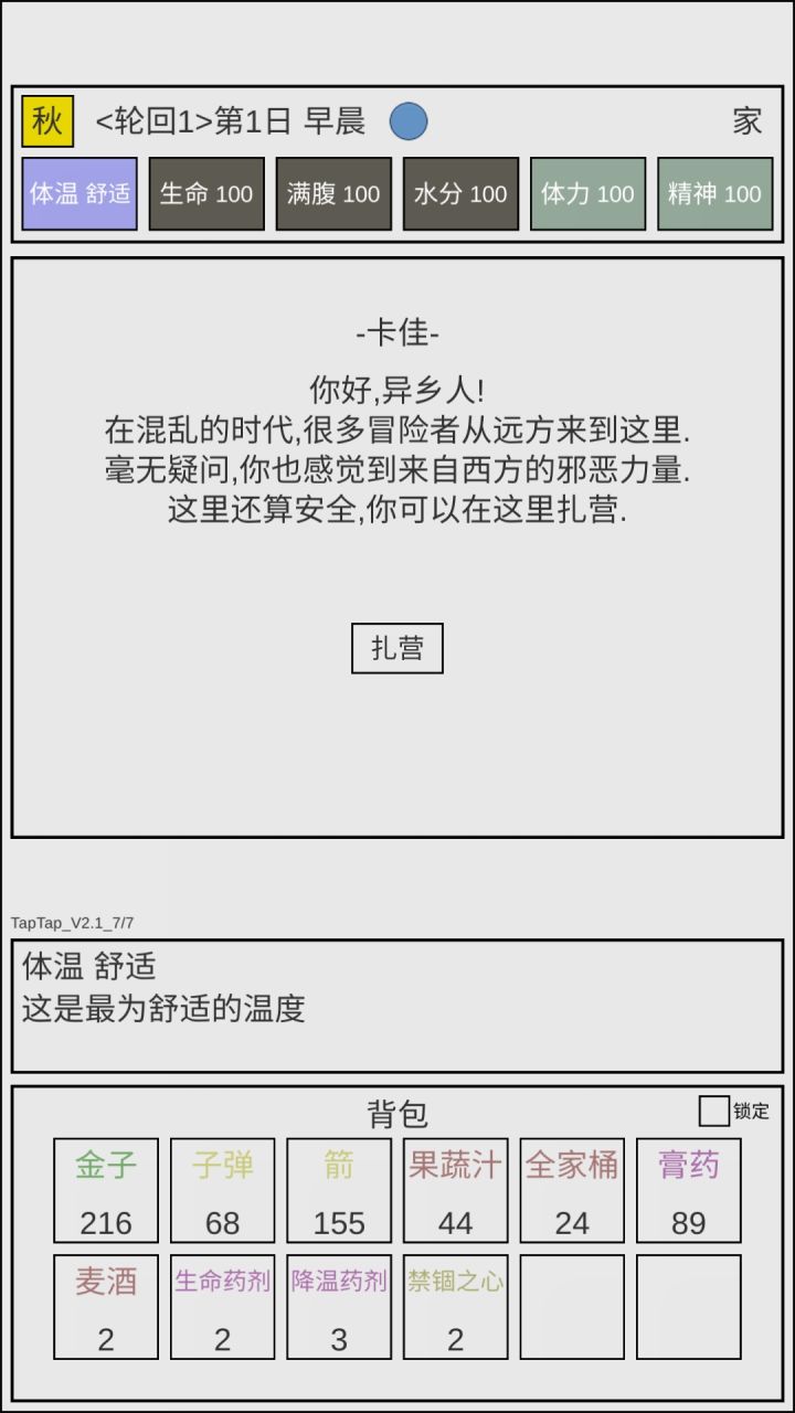 第一个冬天 要有木头,不然不能睡觉,不睡觉就等死吧。然后就是。开地图,开地图在溪流,需要14张纸和64个零件,零件不要合成,在镇上捡,然后看看商队有没有能换的,前期很缺铁,没有铁没法开学院,没学院就不用玩这个游戏了,所以实在凑不上再合成。确保吃喝差不多够的时候去下面的地图。冰冻荒原有干草,多捡点,这个用来升级床,然后做草绳结,可以扩展背包和酒桶,最后还要用来做云梯。黑森林的木头是不需要斧子就能收集