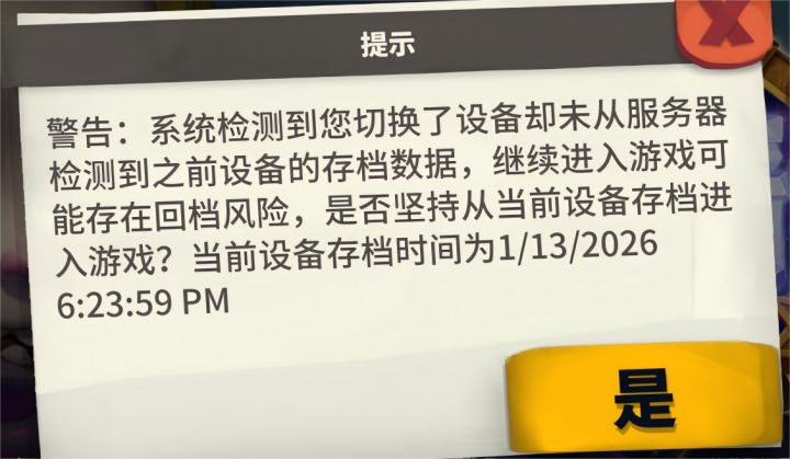 好长时间没切换过设备,今天换了个手机登录,发现多了这个弹窗。想问下官方,我怎么在前一个设备确定我已经上传了数据?我这网络是完全没问题的,也会出现这个问题么?而且这个提示也有问题,我在这个设备完全没登录过,为什么会有十分钟之前的存档?目前是没点是选项,用之前的设备登陆了。#独奏骑士