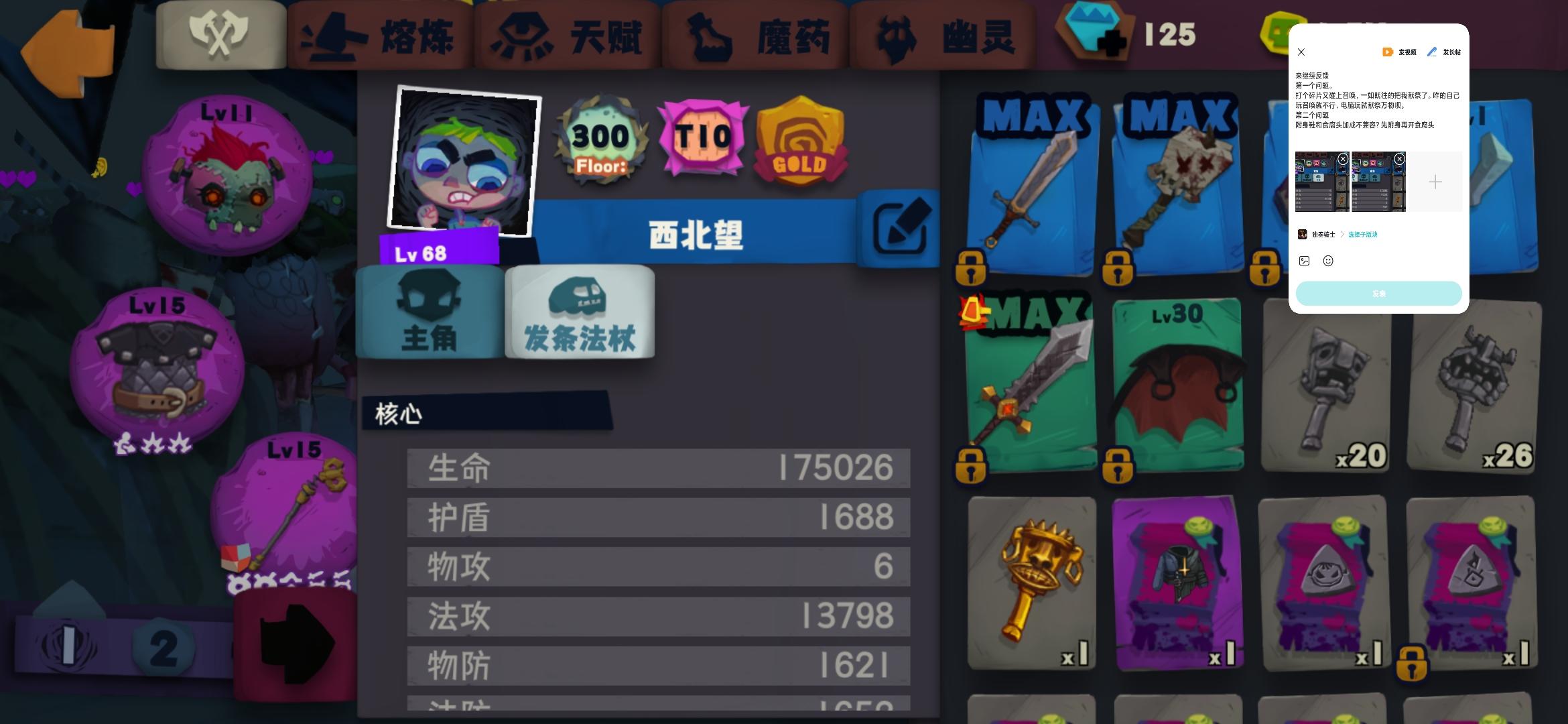 来继续反馈第一个问题。打个碎片又碰上召唤,一如既往的把我献祭了。咋的自己玩召唤就不行,电脑玩就献祭万物呗。第二个问题附身鞋和食腐头加成不兼容?先附身再开食腐头打最高13798。先开食腐头在附身最高9973。第一种情况下如果下来再次附身也是9973。咋的就是看不起召唤师是吧。客服是不是又要问我什么渠道什么版本了,我告诉你tap,最新版。要不要我账户号码和密码,你自己在我号上看看情况?