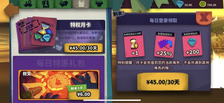 先来说说月卡:为自己热爱的游戏充45元对大多数玩家来说都是物有所值的!但对于我这种肝帝来说月卡作用真心不大,但我还是充值了,因为我热爱这种随时随地想玩就玩,想停就停的游戏!所以月卡特权改点实用的吸引大伙充值吧!时装!美与酷的代名词!真心喜爱!但总觉得少了灵魂!对!少了属性!让时装变得可有可无!少了在游戏里向玩家的展示,就是少了灵动!独奏骑士的时装太容易获得,所以添加属性不会破坏游戏的平行!大伙来说